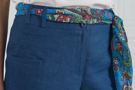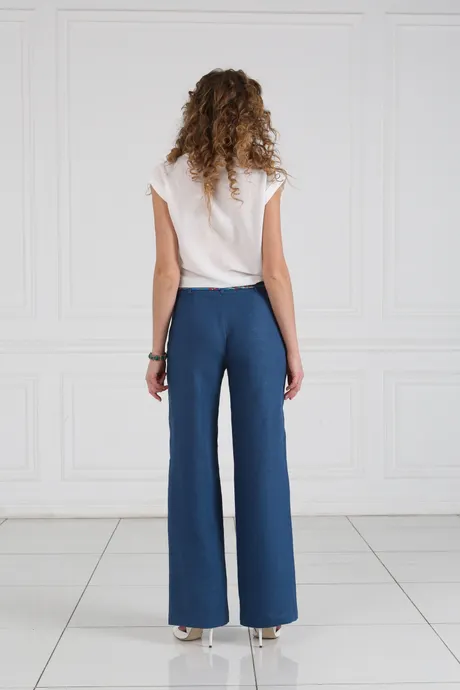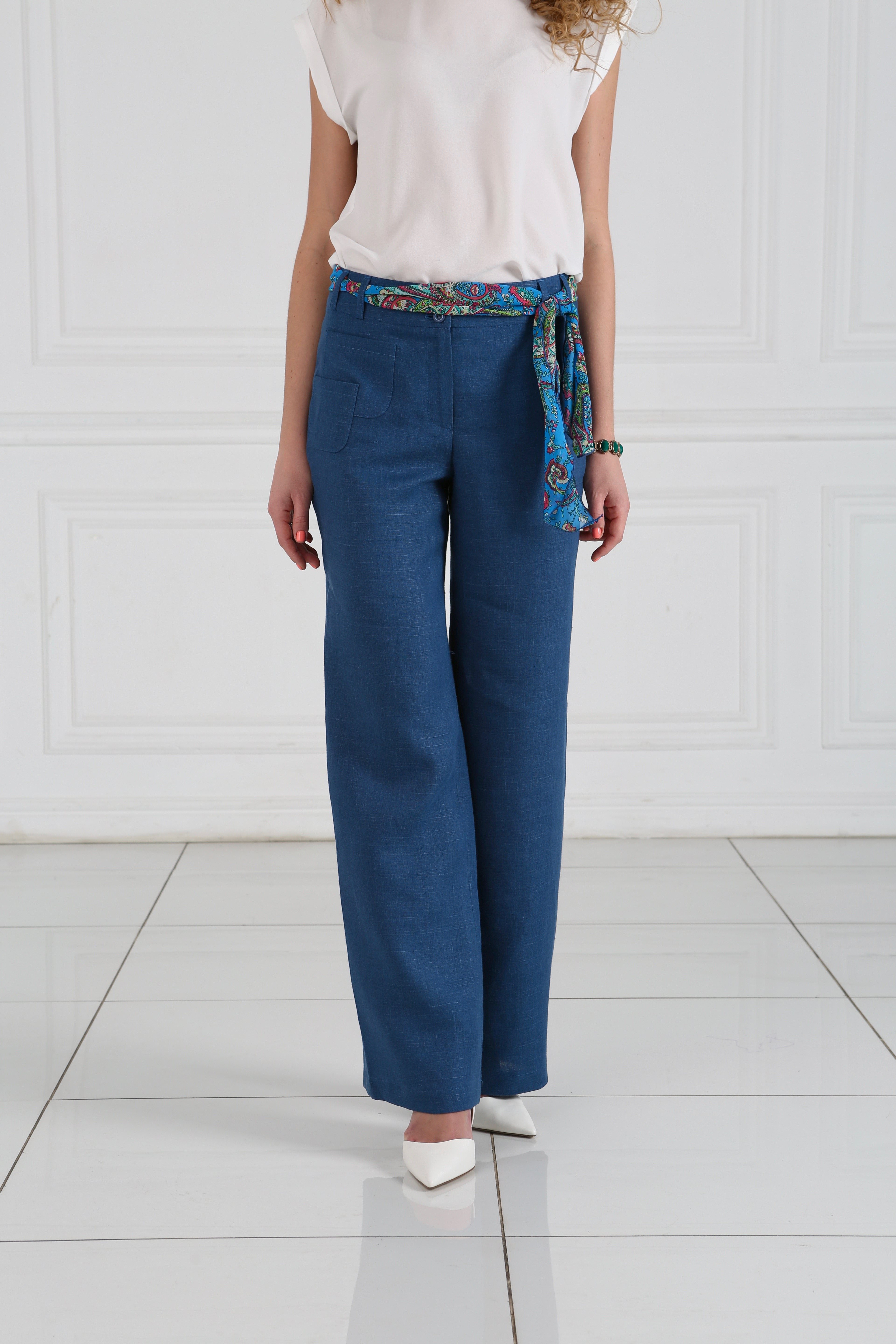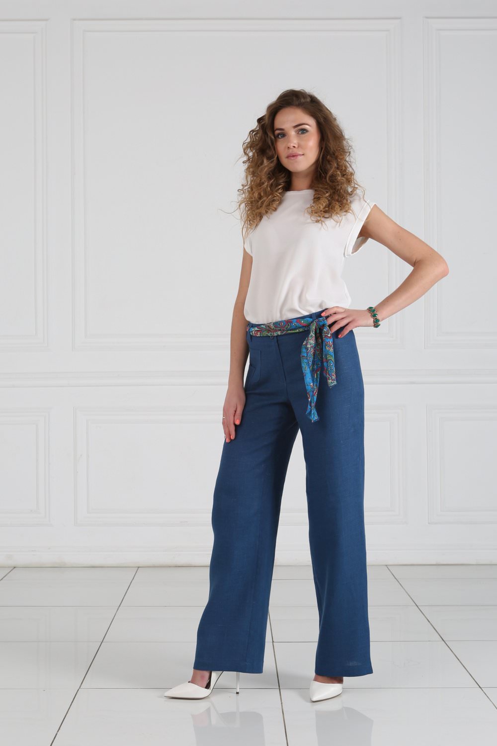 Брюки на средней посадке прямые от бедра с цветным поясом «Лен» синий