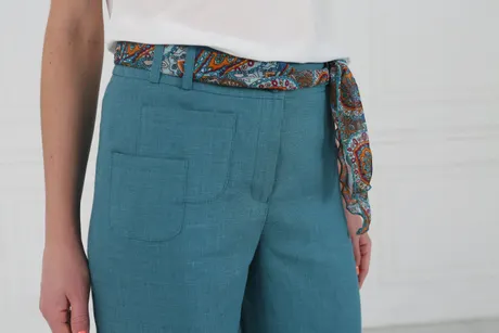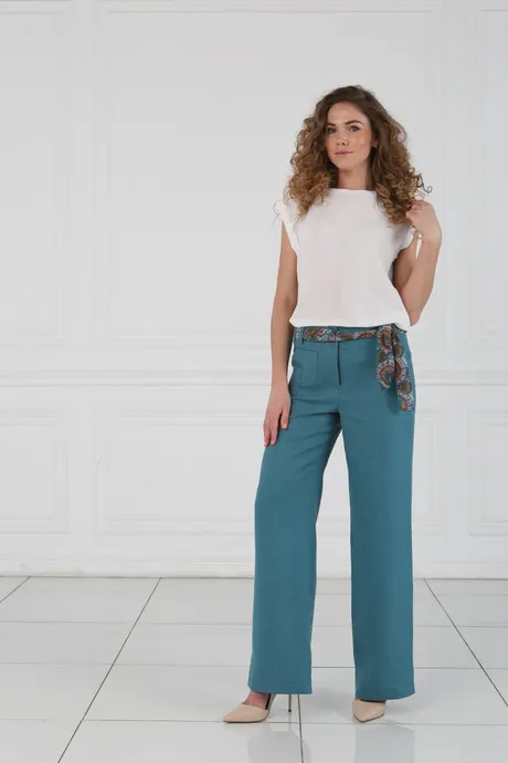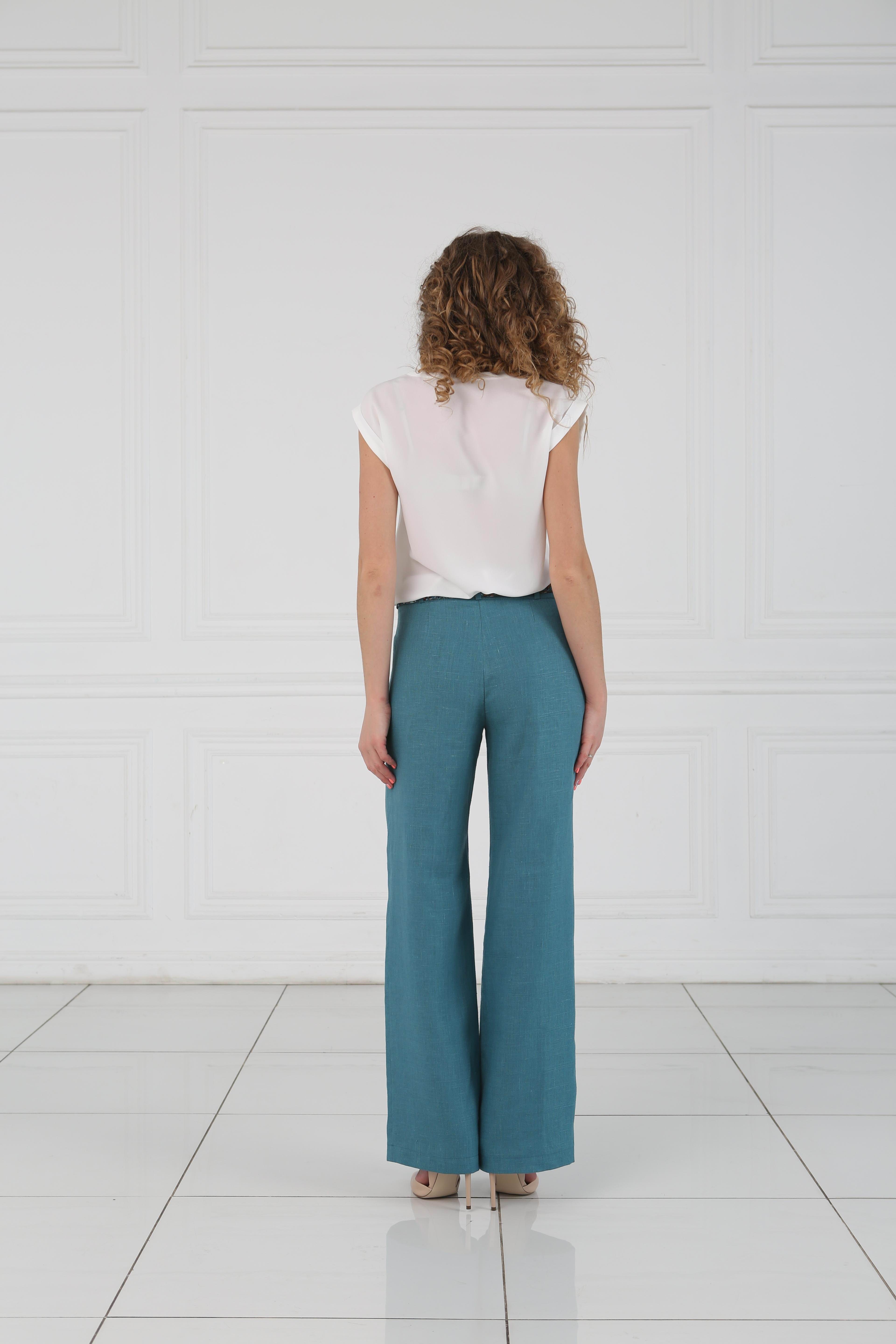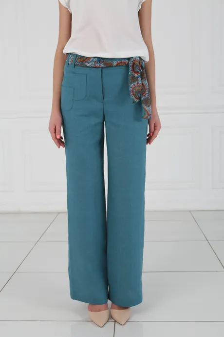 Брюки на средней посадке прямые от бедра с цветным поясом «Лен» морская волна