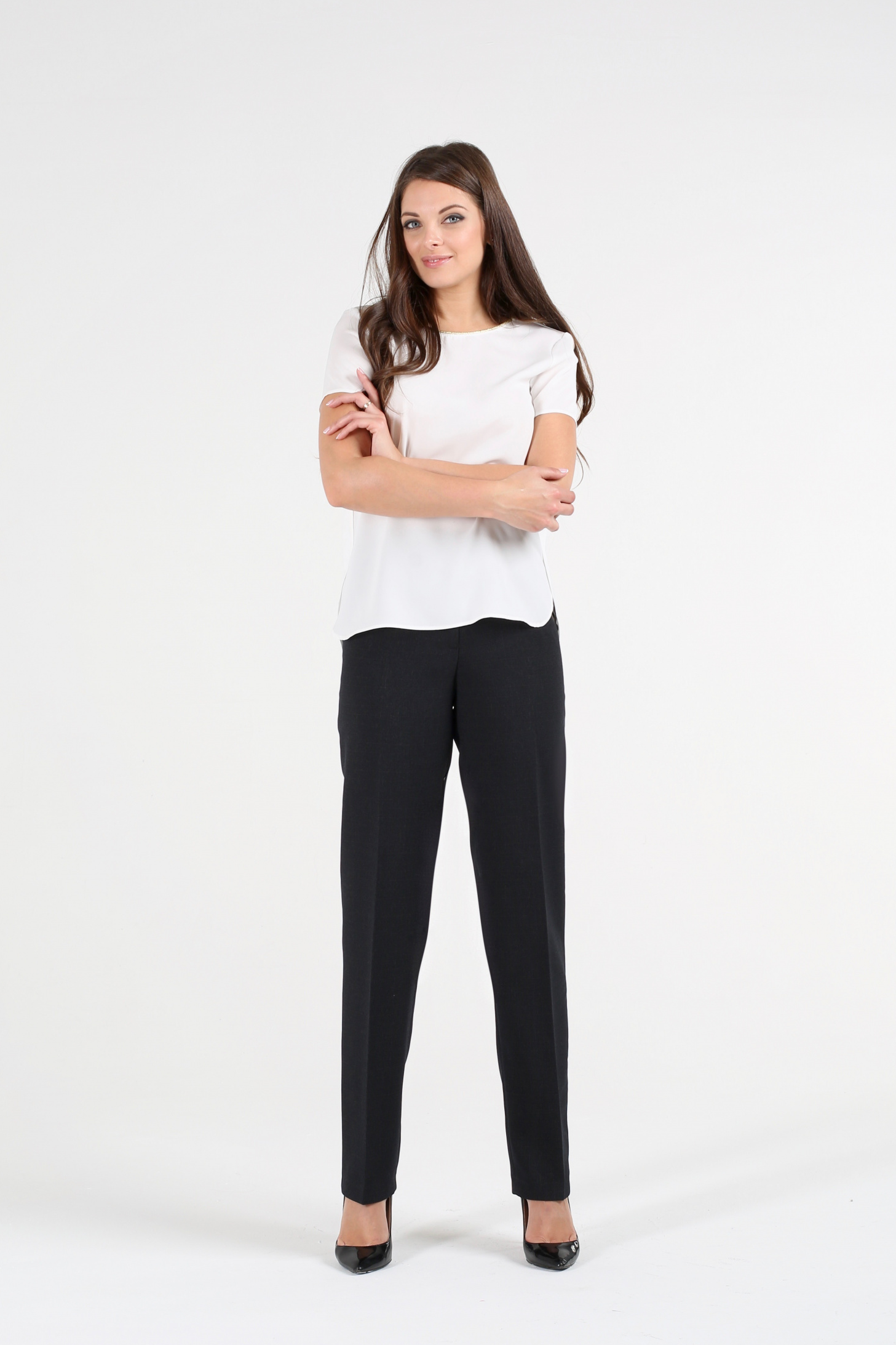 Секрет элегантности брюк «Фемида» – в выигрышной высокой посадке и прямом фасоне. Такое сочетание вытягивает силуэт, делает его стройнее, скрывает лишние объемы на талии и бедрах. Единственное, что требуется от хозяйки наряда, – подобрать эффектную обувь и гармоничный верх. И здесь никаких сложностей не возникнет, поскольку коричневая гамма превосходно сочетается с любыми цветами: от нежных пастельных до эксцентричных ало-оранжевых. Если ваша цель – выглядеть строго и официально, выберите блузу кипенно белого или свежего стального тона. Если хочется нежности, остановитесь на пудровых, бирюзовых, сиреневых, коралловых оттенках. А тем, кто любит удивлять, придутся по вкусу сочные краски огненной палитры.