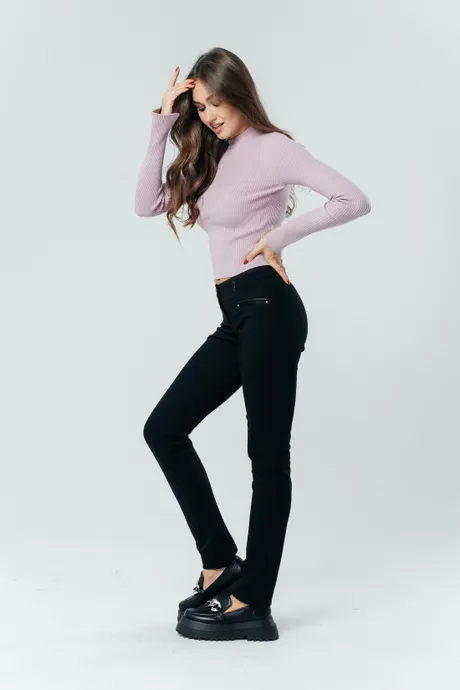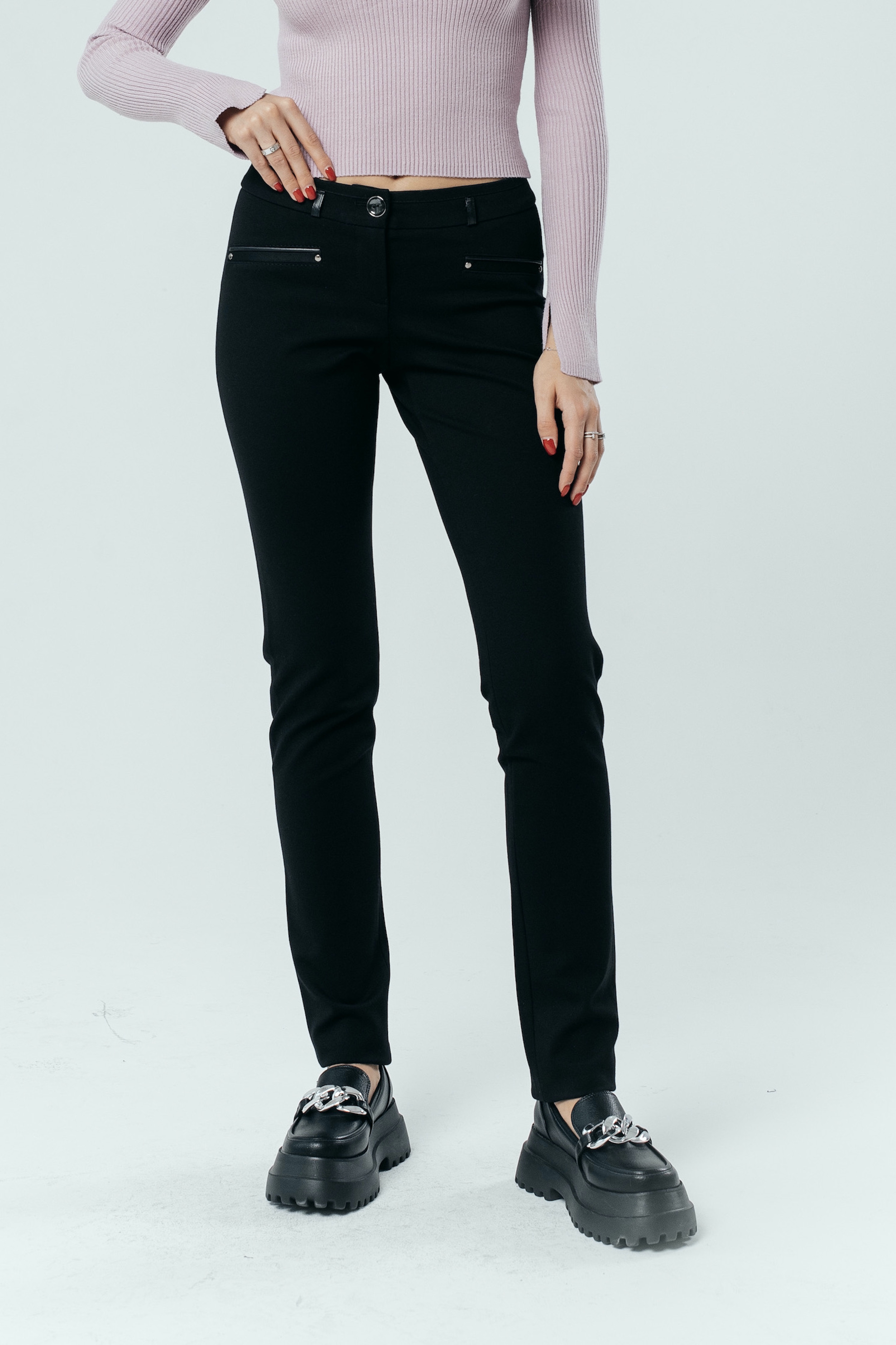 Брюки черные на средней посадке узкие с карманами и отделкой из кожи - «Трикотаж»