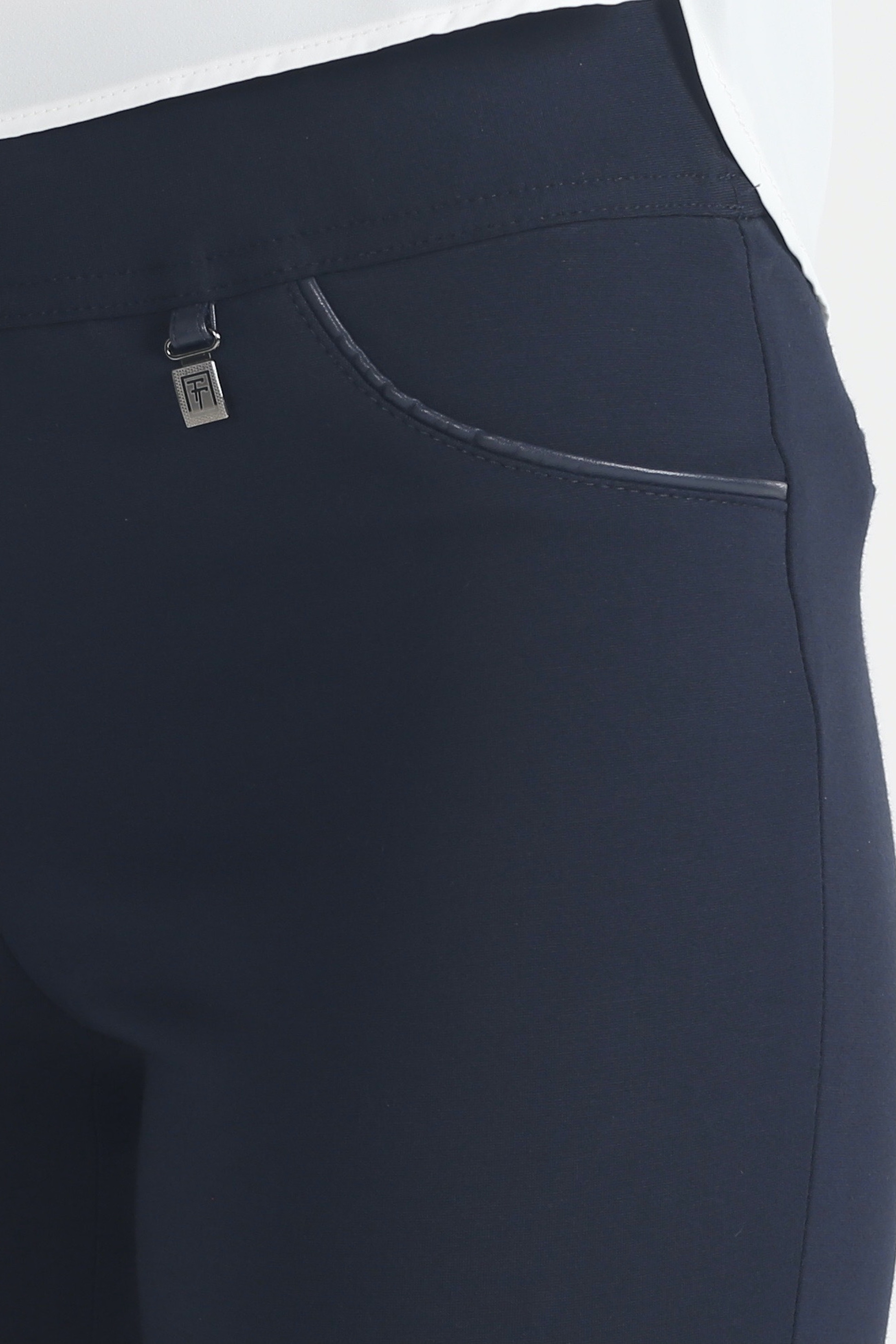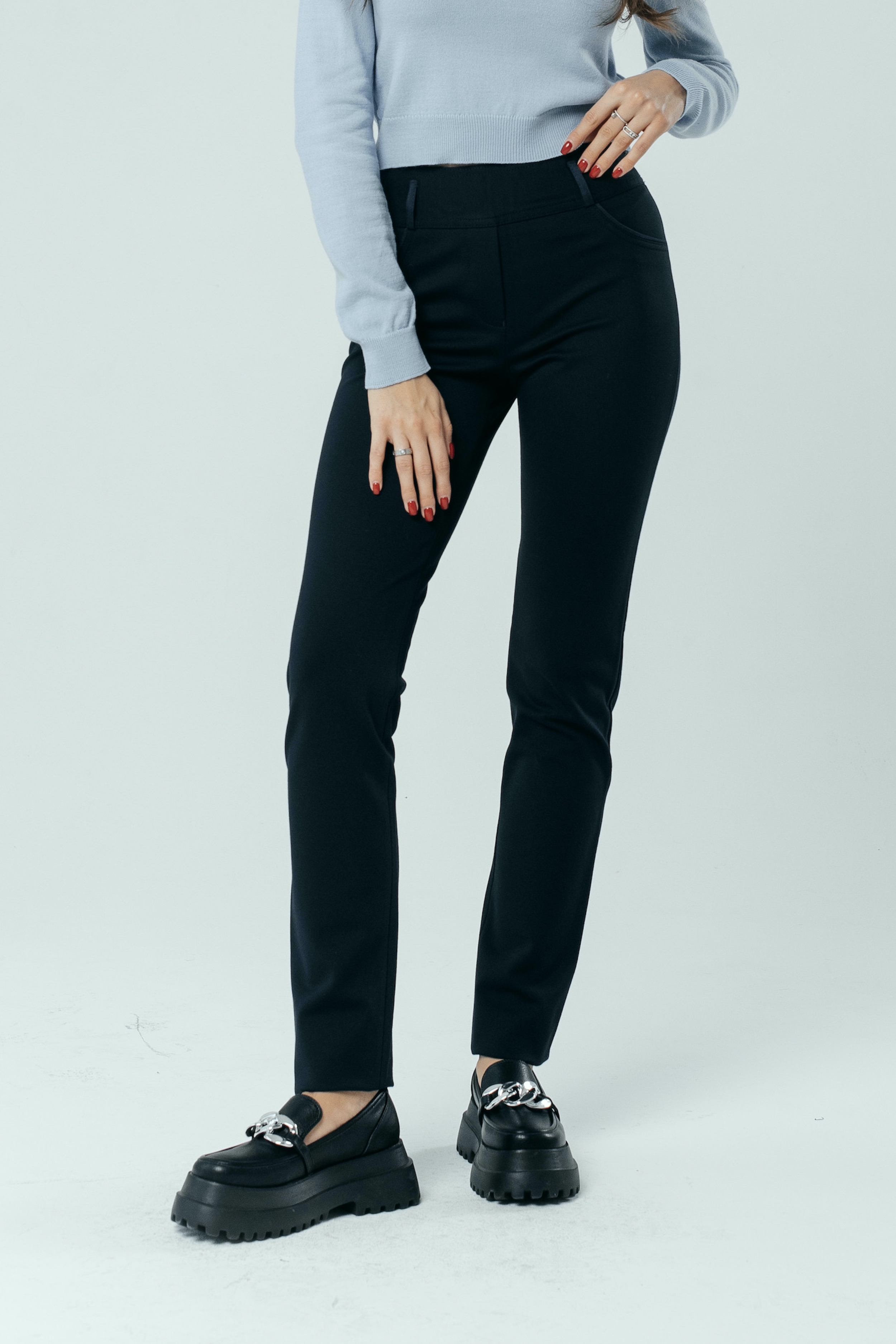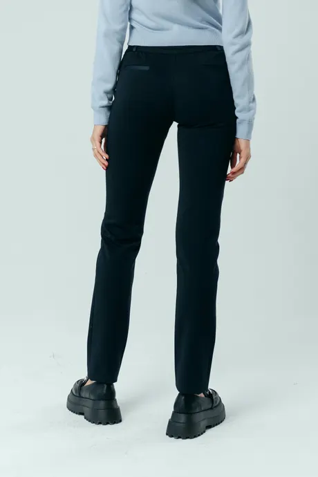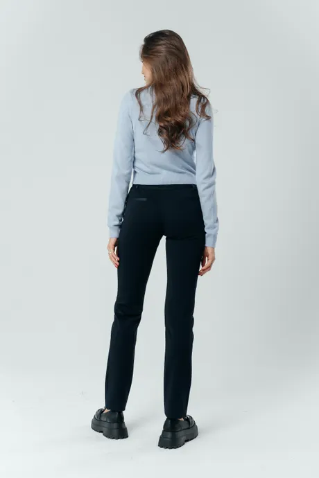 Классические офисные оттенки смотрятся намного эффектнее в сочетании с изящными дизайнерскими акцентами. Синие брюки «Трикотаж» на средней посадке зауженные к низу на резинке с отделкой из кожи только на первый взгляд выглядят просто. Стоит надеть эту модель на работу или дружескую встречу, как все взгляды тут же будут устремлены на вас. В чем причина такого внимания? Разумеется, в изысканном женственном крое, качественной ткани и красивом глубоком цвете. Но не только в этом.