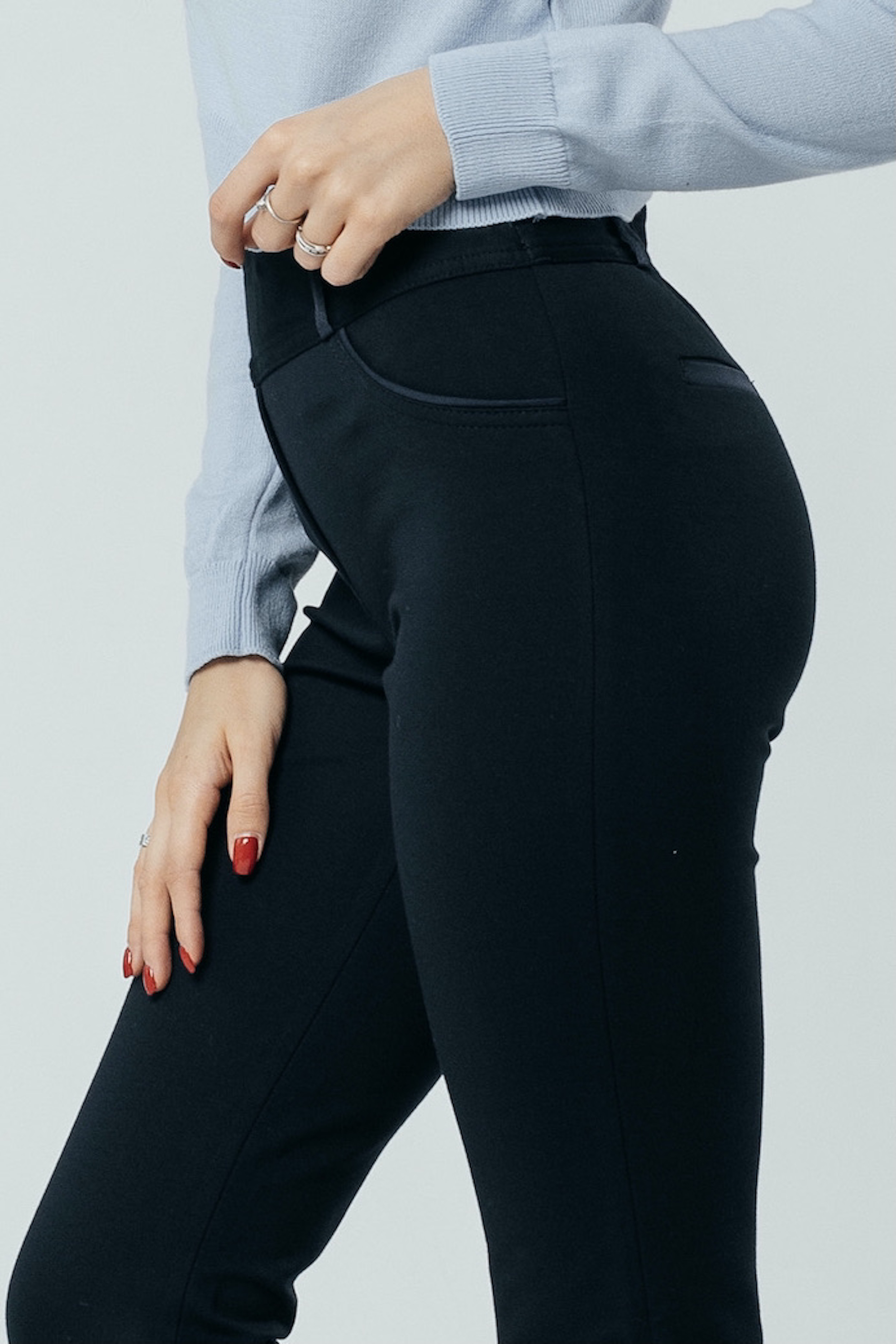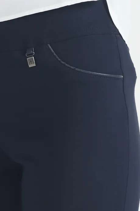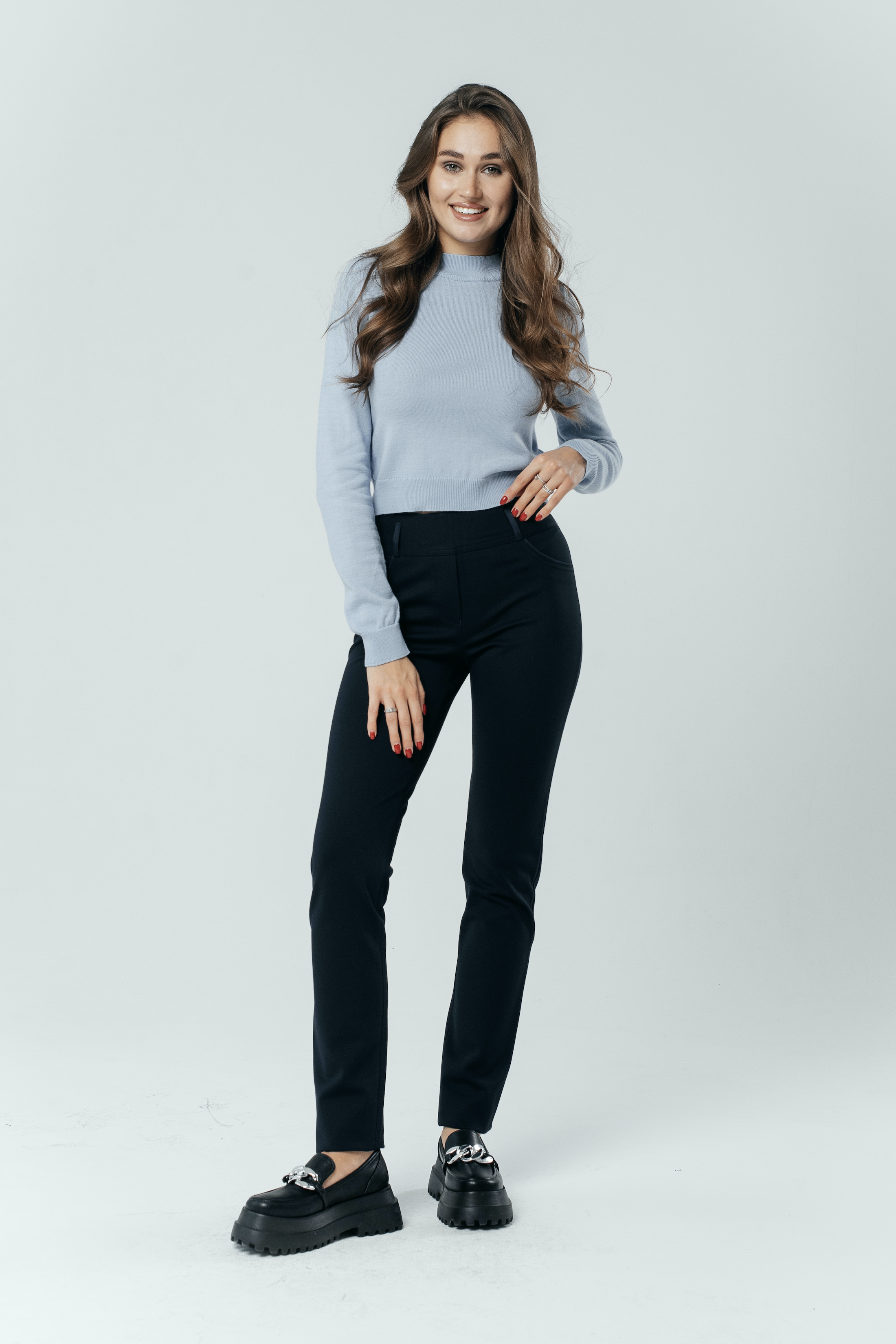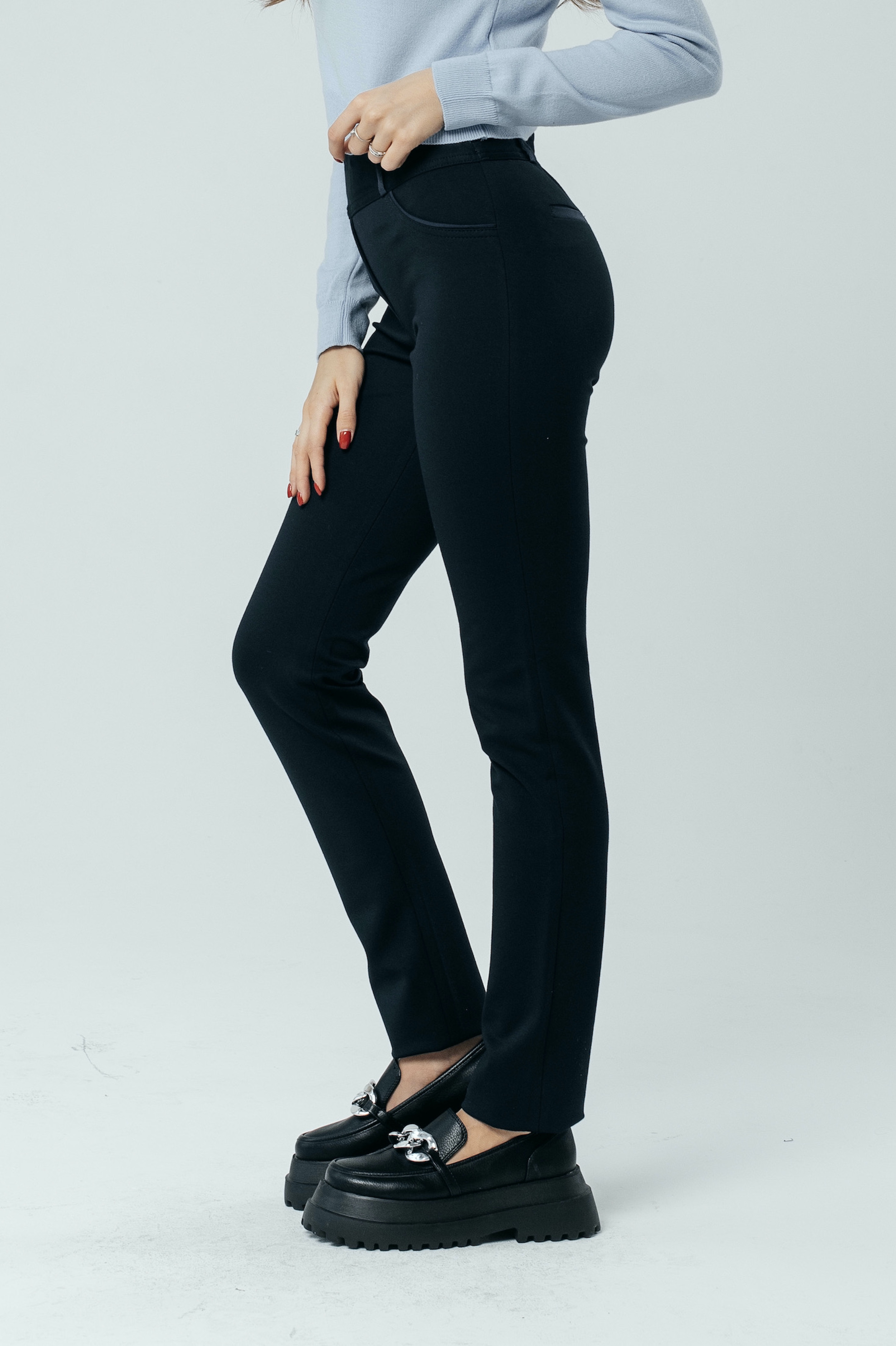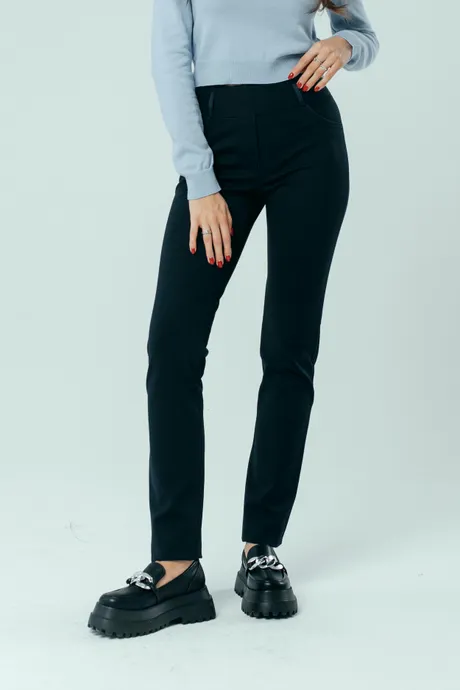 Главный секрет привлекательности стильных брюк «Трикотаж» на средней посадке – в оригинальной отделке из кожи, превращающей строгую повседневную модель в шикарный наряд. В такой одежде вы можете смело отправляться на торжественный прием, важную встречу или званый вечер, не опасаясь выглядеть невзрачно. Только позаботьтесь об элегантной обуви и колоритном верхе. Для весны лучшим выбором будет легкая, воздушная блуза нежных оттенков: мятного, кораллового, бирюзового, сиреневого. Она сделает праздничный образ еще нежнее и изящнее. Осенью роскошные зауженные к низу брючки украсит мягкий кардиган сочного цвета или свободный пиджак в стиле «ретро». Не бойтесь экспериментировать с рюшами, кружевом, крупными аксессуарами, необычными принтами и расцветками: спокойная синяя гамма допускает любые вольности. А о комфорте и тепле позаботится мягкая ткань с включением шерсти и удобная резинка на талии.