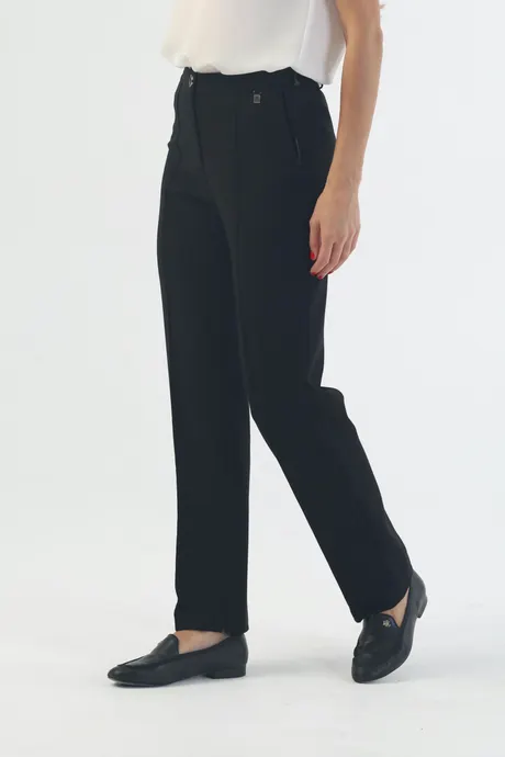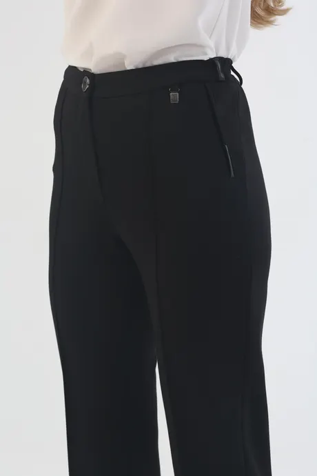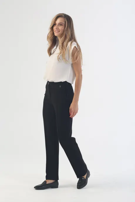 Изюминка модели – четко простроченные стрелки и зауженный крой с высокой посадкой, которые делают хозяйку стройнее и визуально удлиняют силуэт. Используйте эту особенность, чтобы подчеркнуть достоинства фигуры. Эффектные длинноногие девушки могут комбинировать строгую черную модель с верхом любого цвета и формы, не сдерживая фантазию. Если нужен классический образ, заправьте в брюки светлую блузу, по необходимости дополнив ее жилетом или пиджаком. Если дресс-код позволяет, выберите яркий джемпер или водолазку сочного оттенка, добавьте к ним туфли в тон, броские лаковые ботинки или экстравагантные ботильоны со звериным принтом. Невысоким дамам стоит придерживаться темной гаммы, включать в наряд вертикальные линии, V-образные вырезы, обувь на каблуке или платформе. Не бойтесь длины 7/8 – в сочетании с однотонным верхом такая модель не уменьшит рост, а напротив добавит пару сантиметров. Благодаря входящей в состав шерсти брючки «Трикотаж» превосходно согреют в холодную погоду, а удобная резинка на талии добавит комфорта.