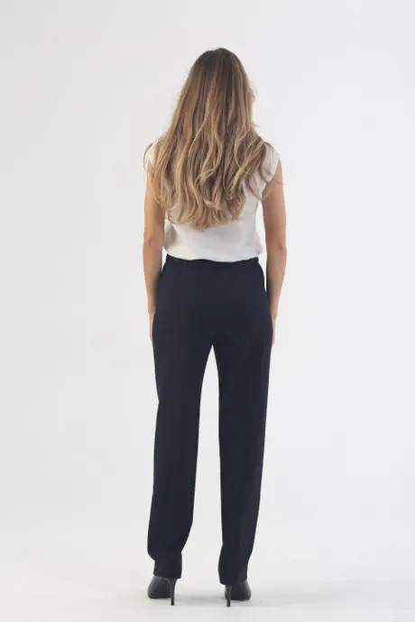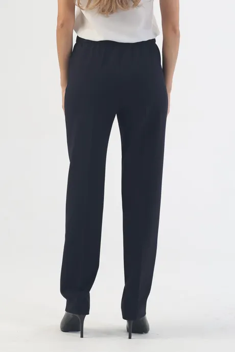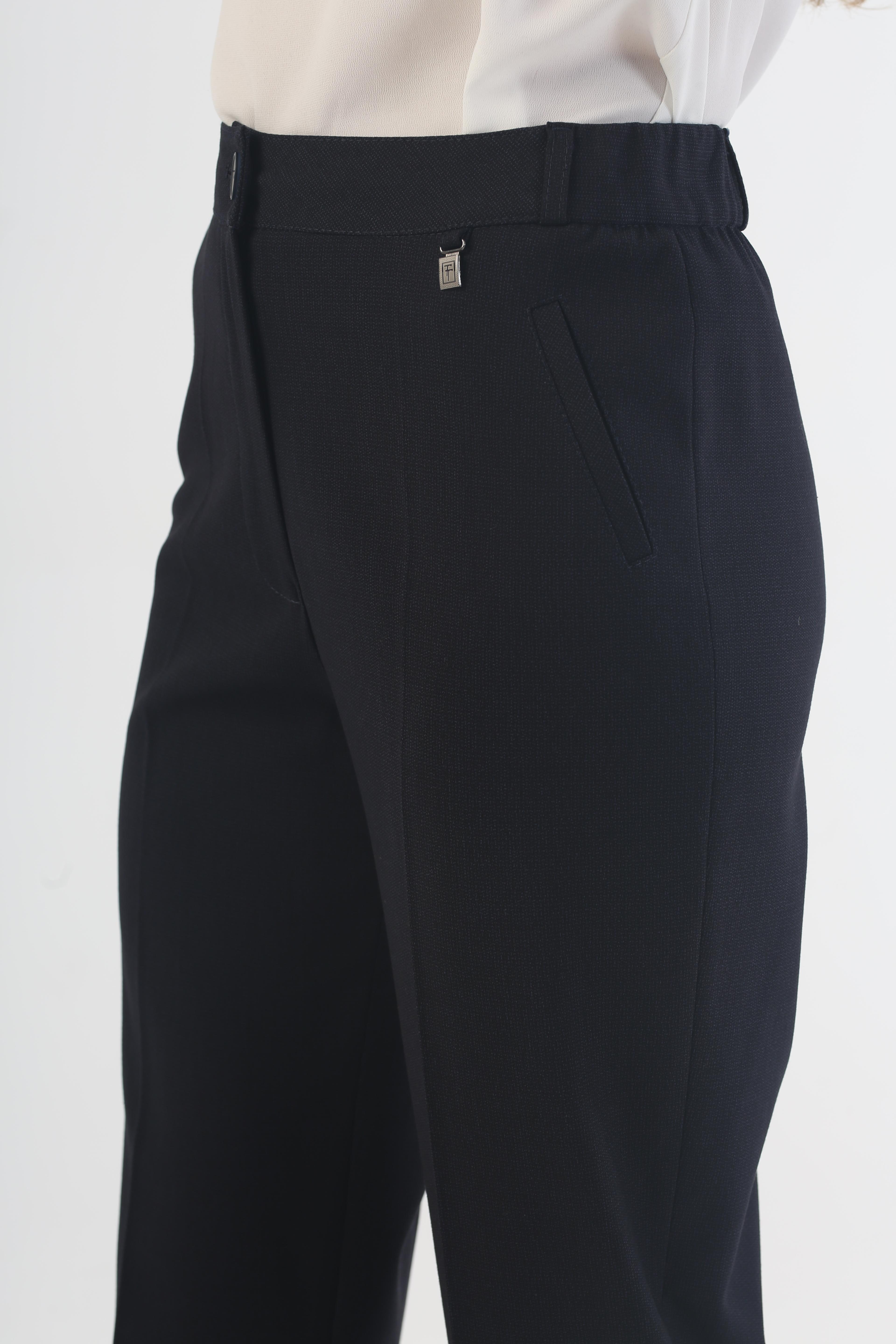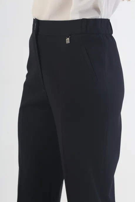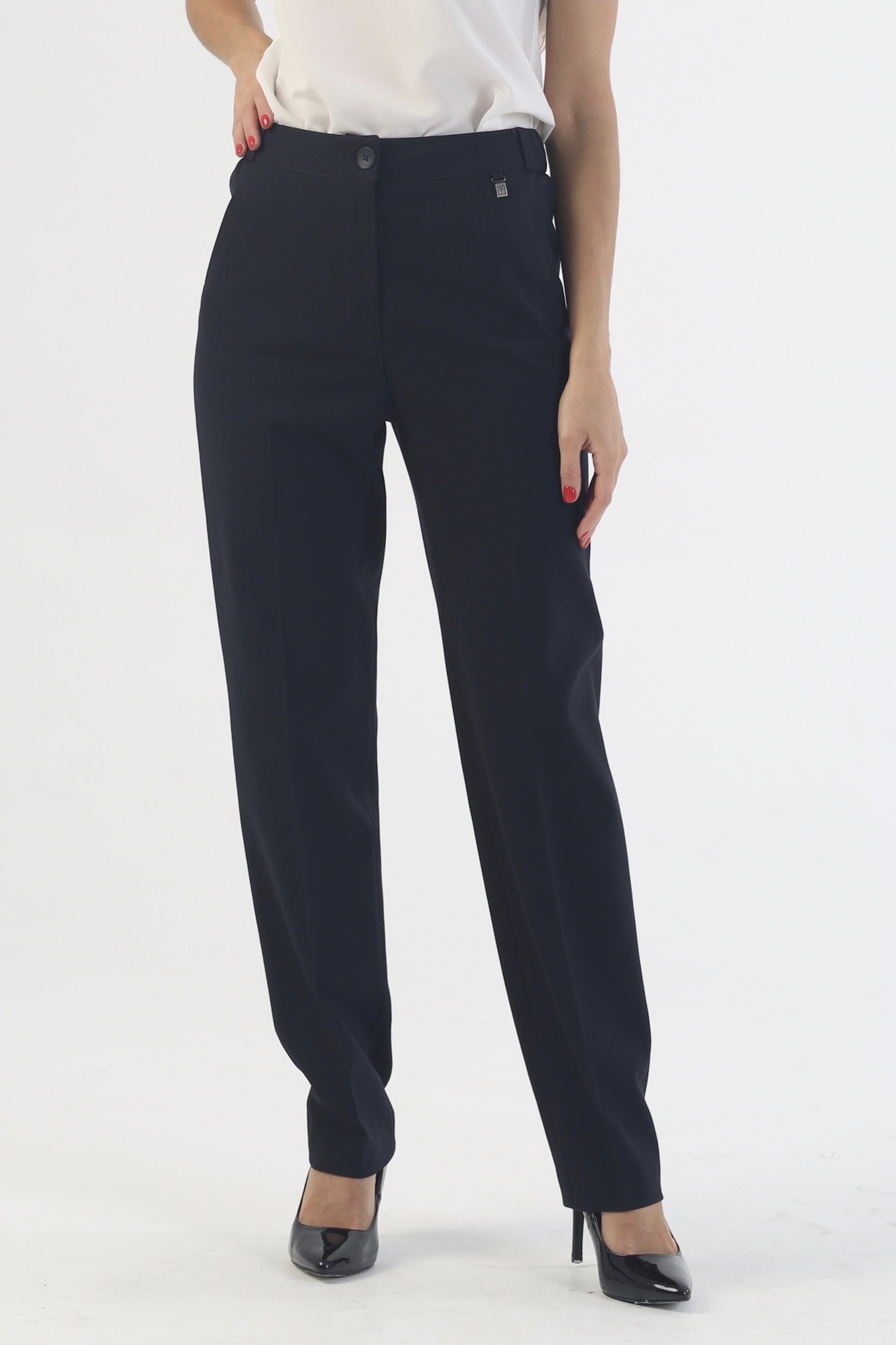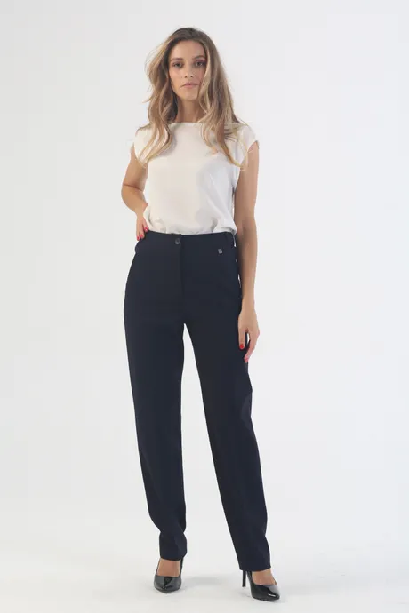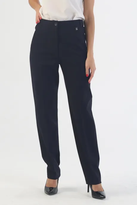 Темно-синяя гамма – хорошая альтернатива слишком официальному черному цвету. Она смягчает и разбавляет строгие деловые наряды. Зауженный, в меру облегающий силуэт подчеркивает красоту женственных изгибов, высокая посадка маскирует складки на талии и бедрах, необычная фактура ткани с мелким геометрическим орнаментом дарит хозяйке обаяние и нежность. Для удобства модель снабжена резинкой, которая гарантирует свободу движений и не давит на живот при работе в положении сидя.
