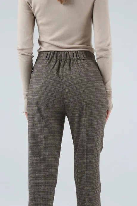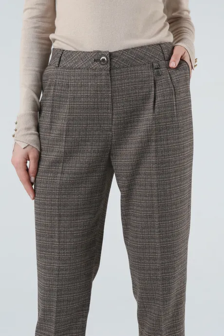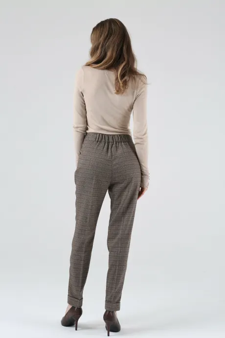 Элегантные брюки с высокой посадкой изготовлены из ткани на основе полиэстера с добавлением вискозы и лайкры. Удобный вариант повседневной одежды на весну, осень или прохладное лето. Материя хорошо держит форму, не мнется, не растягивается после стирки. Неброский бежево-коричневый цвет делает данную модель брюк отличным вариантом одежды на каждый день.