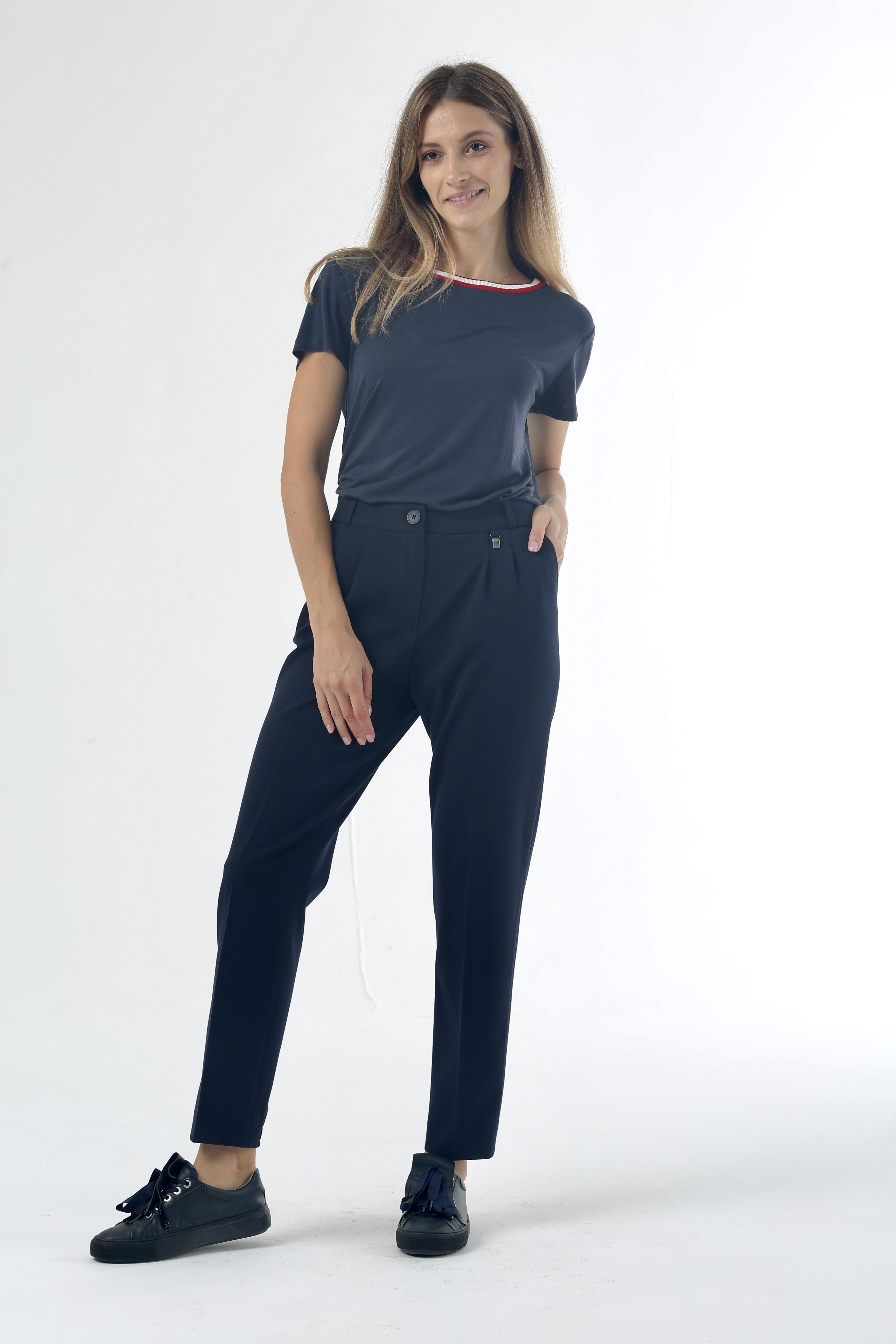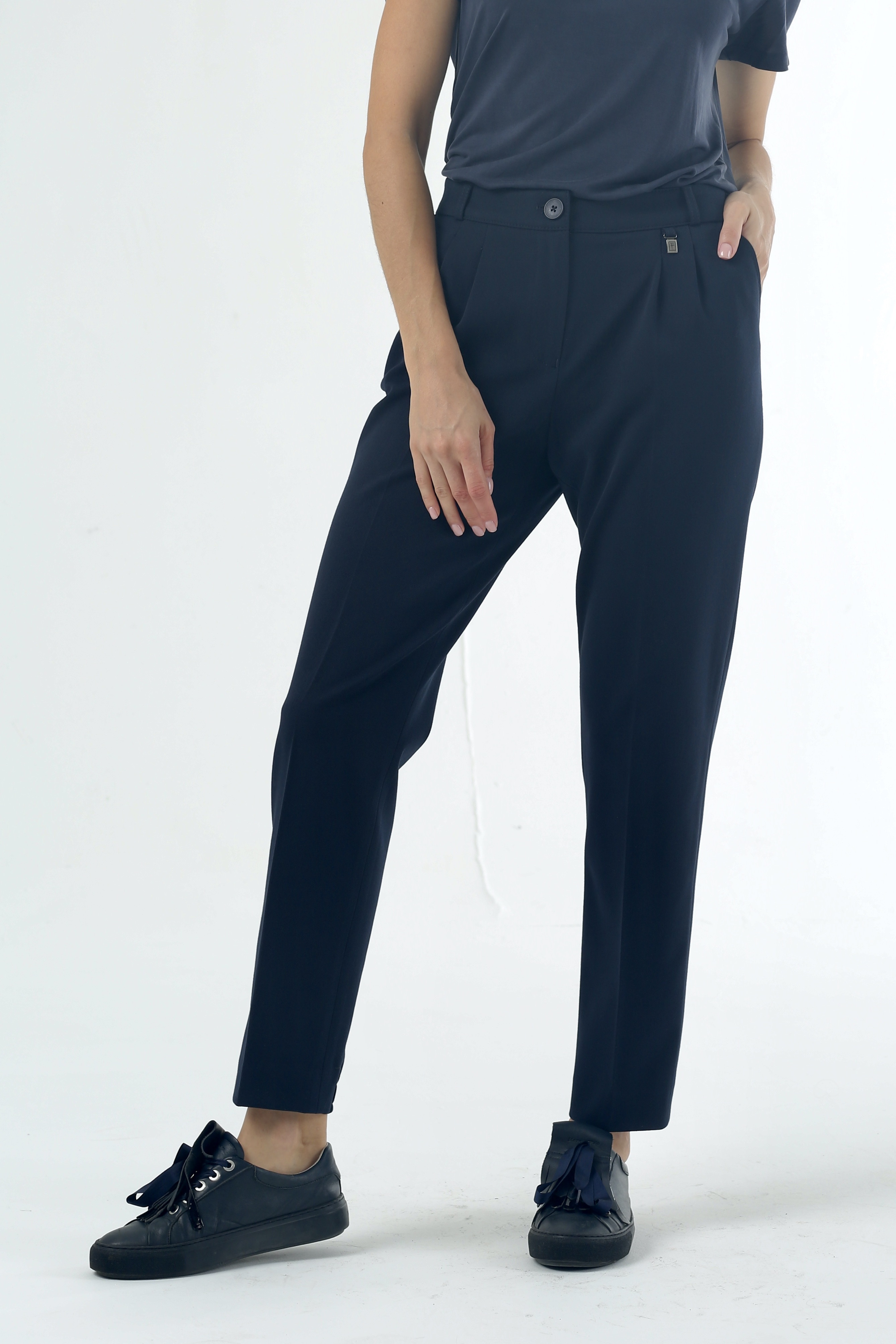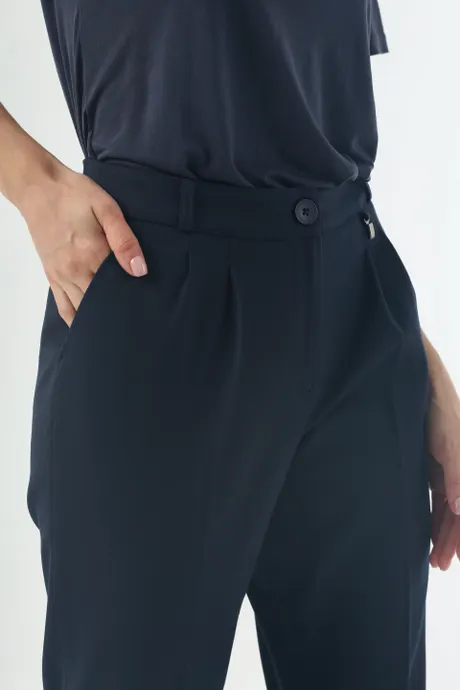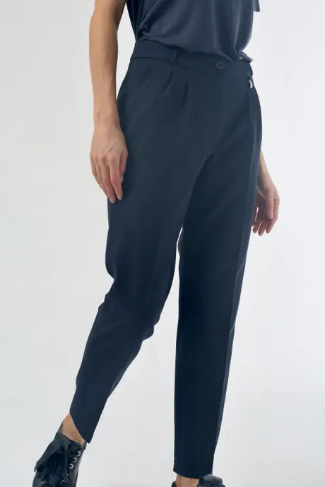 Ищете универсальные брюки, которые будут сочетаться с любой одеждой и подходят для любого случая? "Броди" - это именно то, что вам нужно! Эти синие зауженные брюки на высокой посадке с защипами на 7/8 длины сочетают в себе комфорт и стиль. Изготовленные из высококачественных материалов, они обеспечивают максимальный комфорт и долговечность, а также легко стираются и гладятся. Благодаря своему стильному дизайну, они подойдут как для работы, так и для вечерней прогулки.