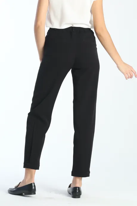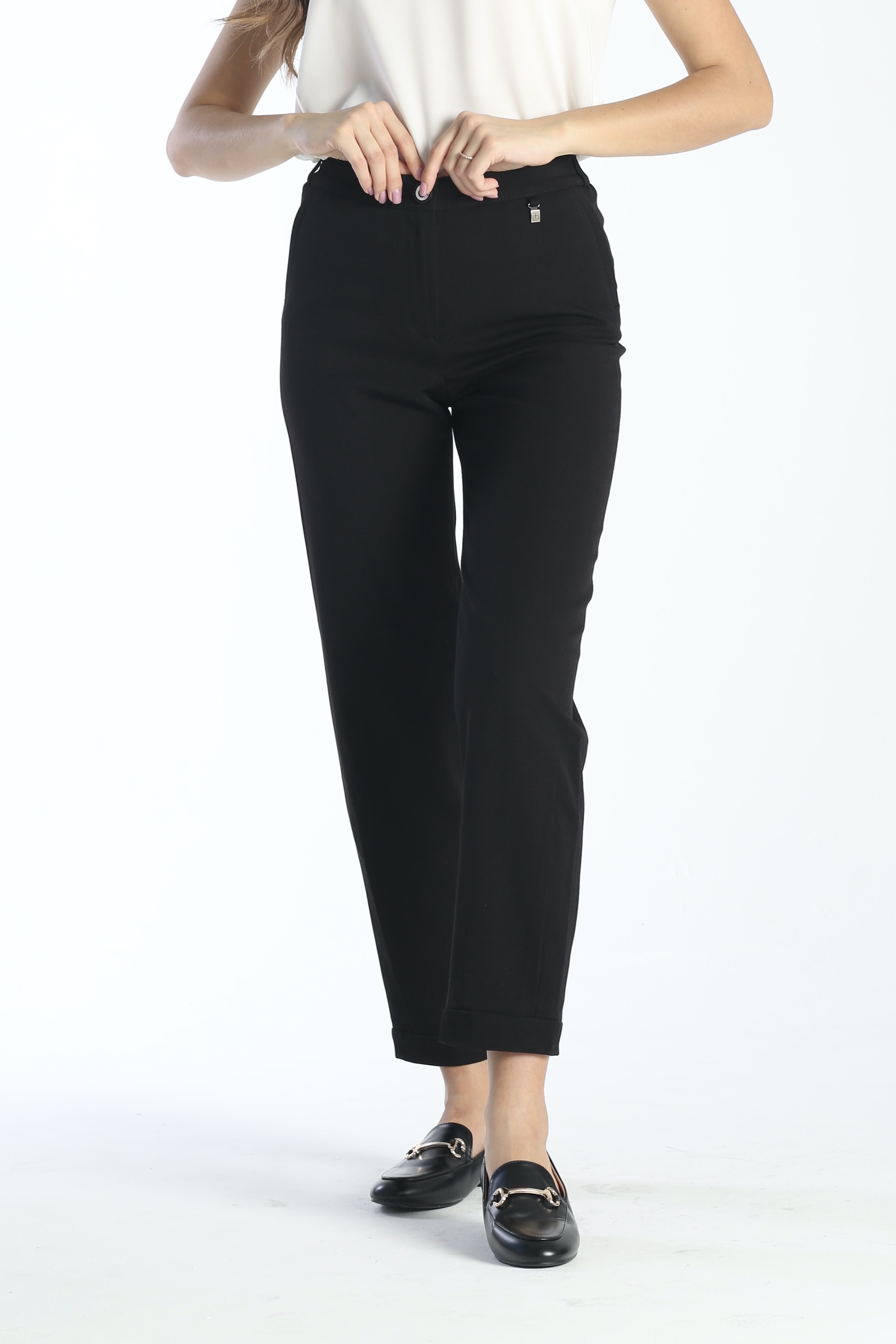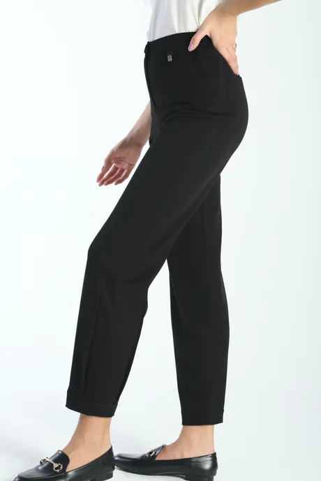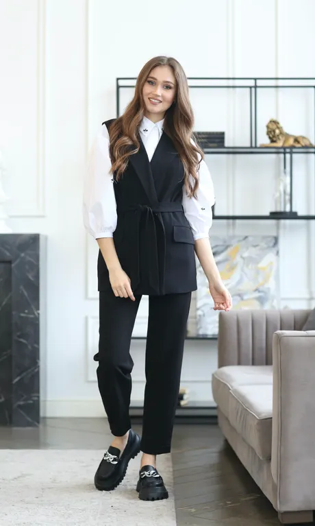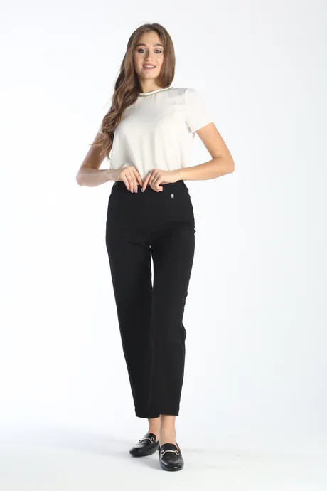 Укороченная длина брюк «Летиция» и сужающийся книзу силуэт позволяют комбинировать их с разными фасонами одежды. К такой модели отлично подходит обувь на каблуке или высокой платформе. Ботильоны, зимние сапожки, туфли и кроссовки также отлично сочетаются с этими брюками. Верх можно подбирать в соответствии с погодой и сезоном. Например, прохладной осенью или зимой с брюками «Летиция» можете смело надеть приталенный удлиненный жакет с поясом, стильный кардиган, свитер или худи свободного кроя. Яркие однотонные блузки или кофточки с коротким рукавом и узором из мелких горошин — прекрасное дополнение к модели теплой весной. Выбор цветовой гаммы верха не ограничен. С классическим черным цветом брючек сочетаются и разноцветные яркие майки, и белые блузы, и верх пастельных тонов, и пестрые футболки с разной длиной рукава.