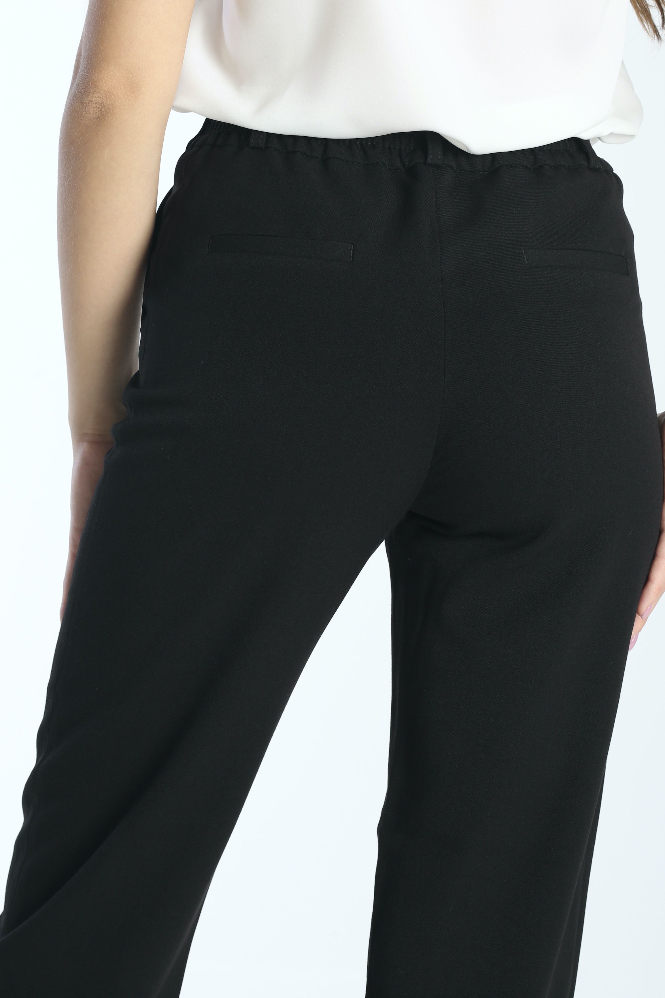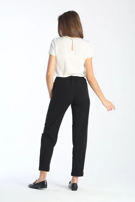 Молодежные брюки на высокой посадке «Летиция» выполнены в классическом черном цвете. Модель рассчитана на сезон «весна-осень» и имеет слегка зауженный книзу силуэт. Такой вариант одежды прекрасно подходит для создания как повседневного, так и нарядного образа. Брюки этой модели можно надевать на работу в офис и комбинировать с разными стилями.