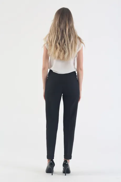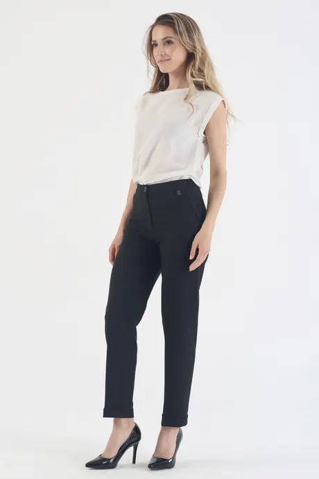 Классическая черная палитра в этой модели эффектно сочетается с идеально ровными стрелками, стильной длиной 7/8 и кокетливыми манжетами. Высокая посадка – прекрасный выбор для девушек небольшого роста, желающих казаться стройнее. Слегка зауженный к низу крой изящно маскирует недостатки фигуры, подчеркивая женственность. Резинка на поясе обеспечивает комфорт во время долгого трудового дня, эластичная плотная ткань на основе вискозы дарит ощущение уюта. Чувствуйте себя легко и свободно в элегантных брюках «Модис», демонстрируя исключительный вкус.