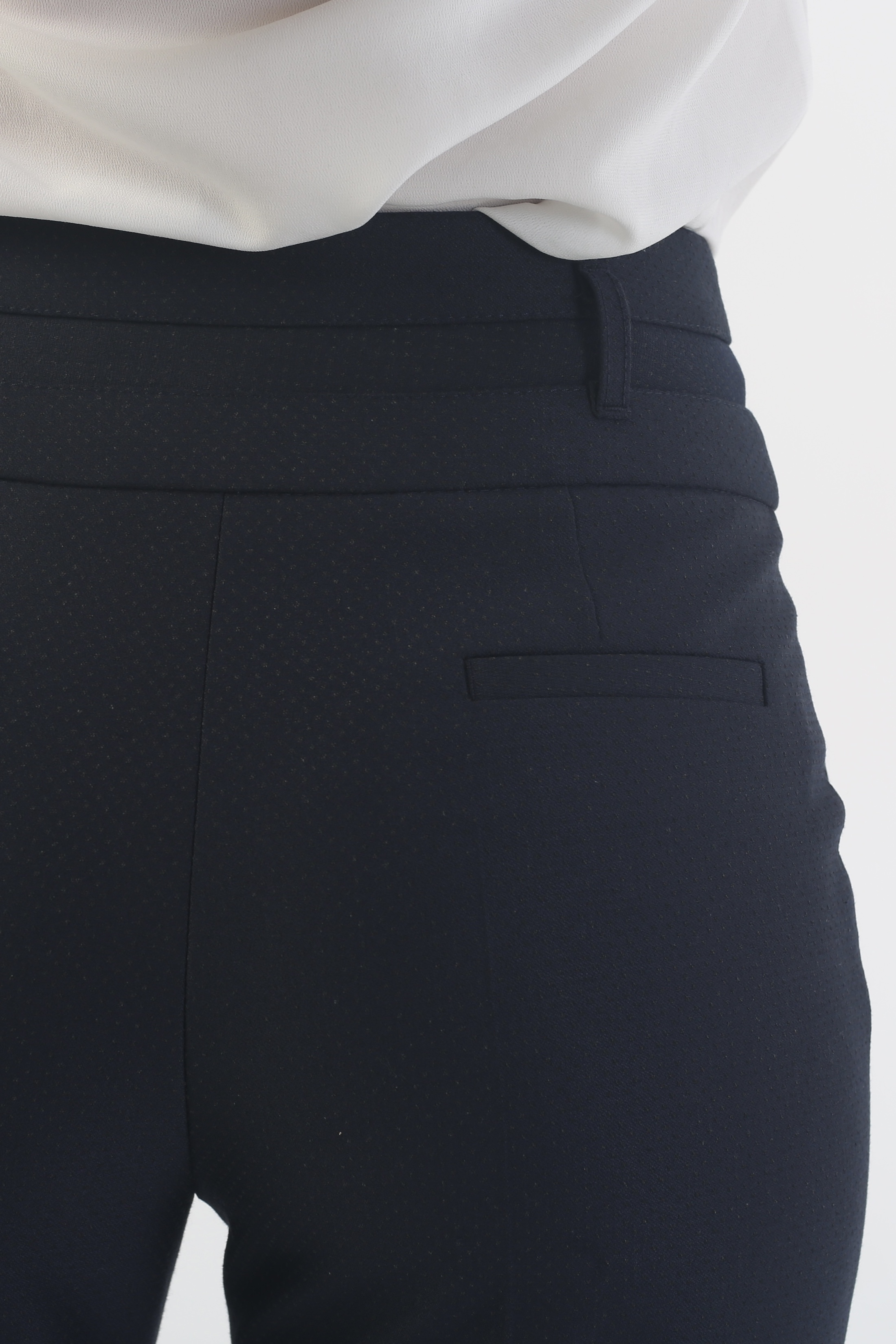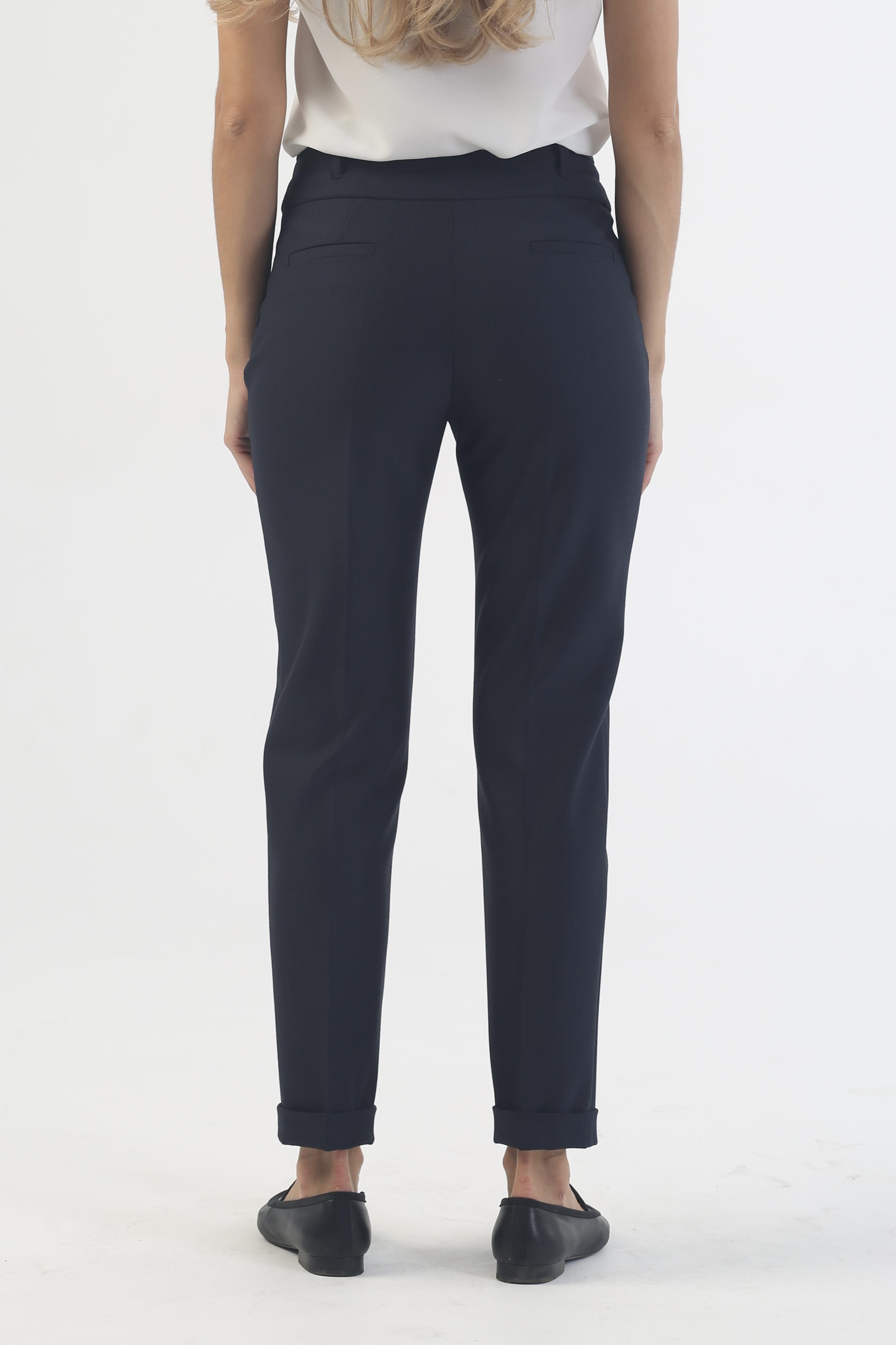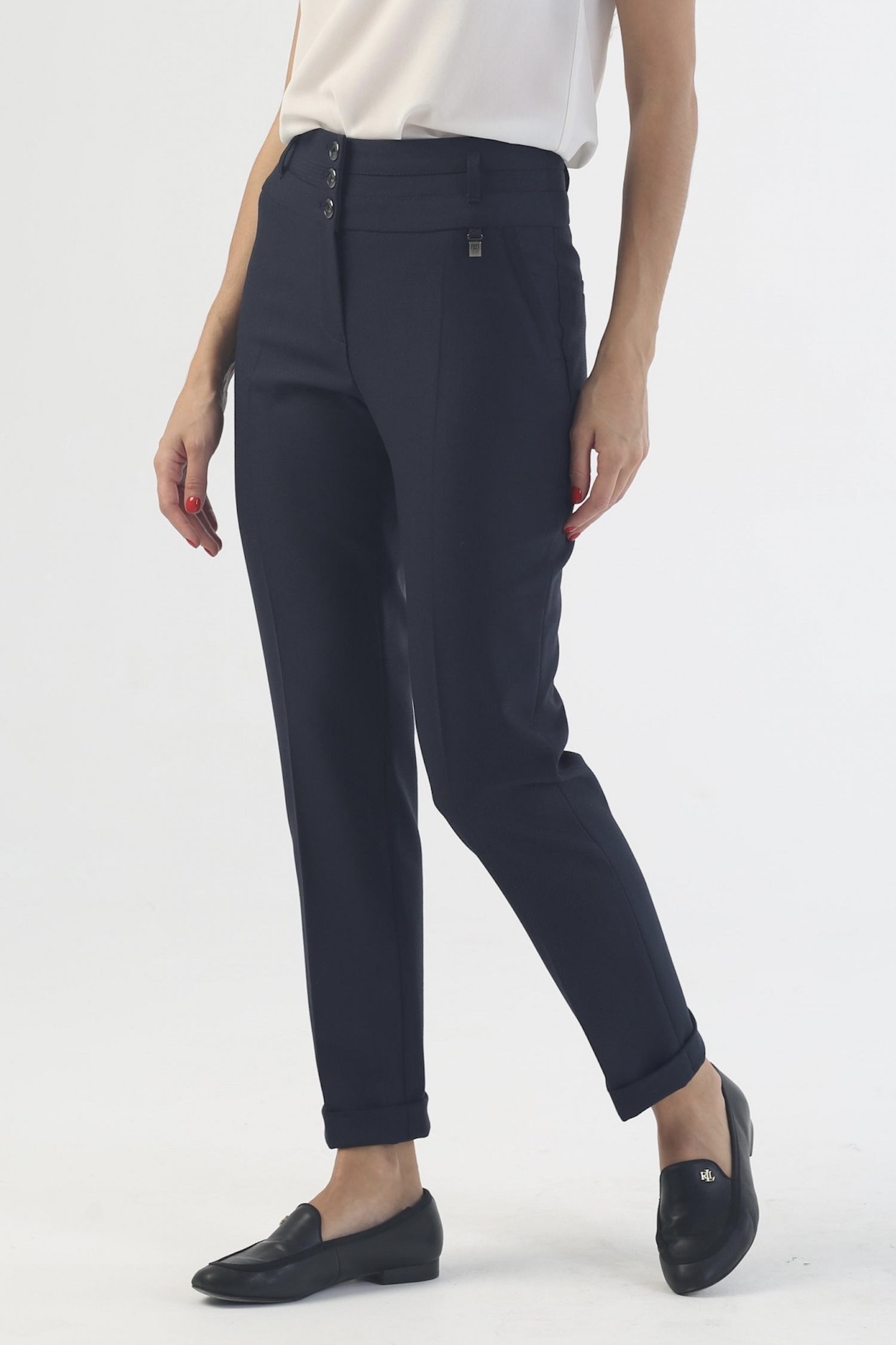 Деловые и повседневные образы не рекомендуется перегружать деталями, узорами или яркими цветами. Поэтому в синих зауженных брюках «Ринальдини» на средней посадке 7/8 длины с манжетами нет ничего лишнего. Совершенный в меру облегающий крой, темная плотная ткань с едва заметным геометрическим принтом, четкие линии и неизменная элегантность, присущая всем моделям дизайнерского Дома ТТ.