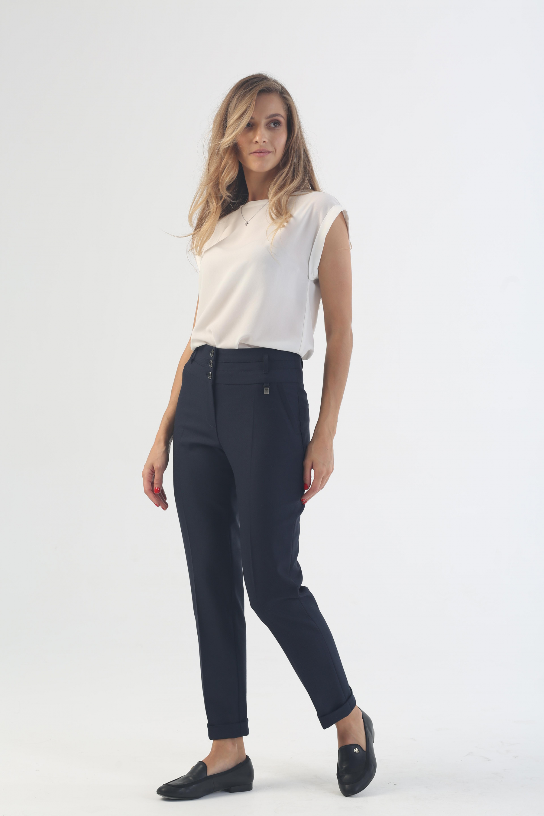Но без оригинальных акцентов не обошлось, иначе классический образ получился бы слишком пресным. Модный зауженный силуэт в брюках «Ринальдини» дополнен кокетливыми манжетами и декоративными карманами, традиционная средняя посадка – широким поясом на пуговицах с имитацией ремешка, безупречно ровные стрелки – нестандартной длиной 7/8. Комбинация всех элементов дает идеальную основу для экспериментов на тему повседневных нарядов. Приглушенная синяя гамма допускает любые сочетания цветов, форм и фактур. Добавьте в образ легкости с помощью светлых воздушных блуз или эксцентричности, включив в ансамбль яркую обувь. Используйте любимые аксессуары, чтобы поднять настроение, если рабочий дресс-код позволяет, и уютные мягкие ткани, чтобы сделать будни комфортнее.