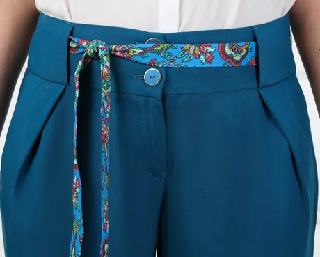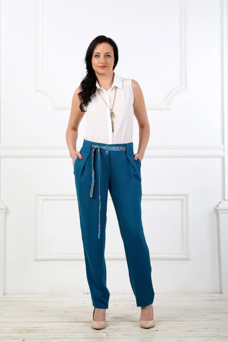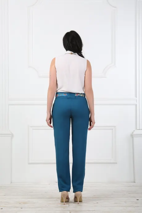 Брюки бирюзовые на средней посадке зауженные к низу с защипами, карманами и цветным поясом - «Штапель»