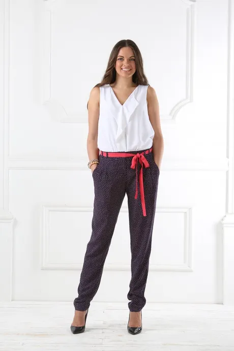 Брюки сине-розовые на средней посадке, на резинке с поясом - «Дождик»