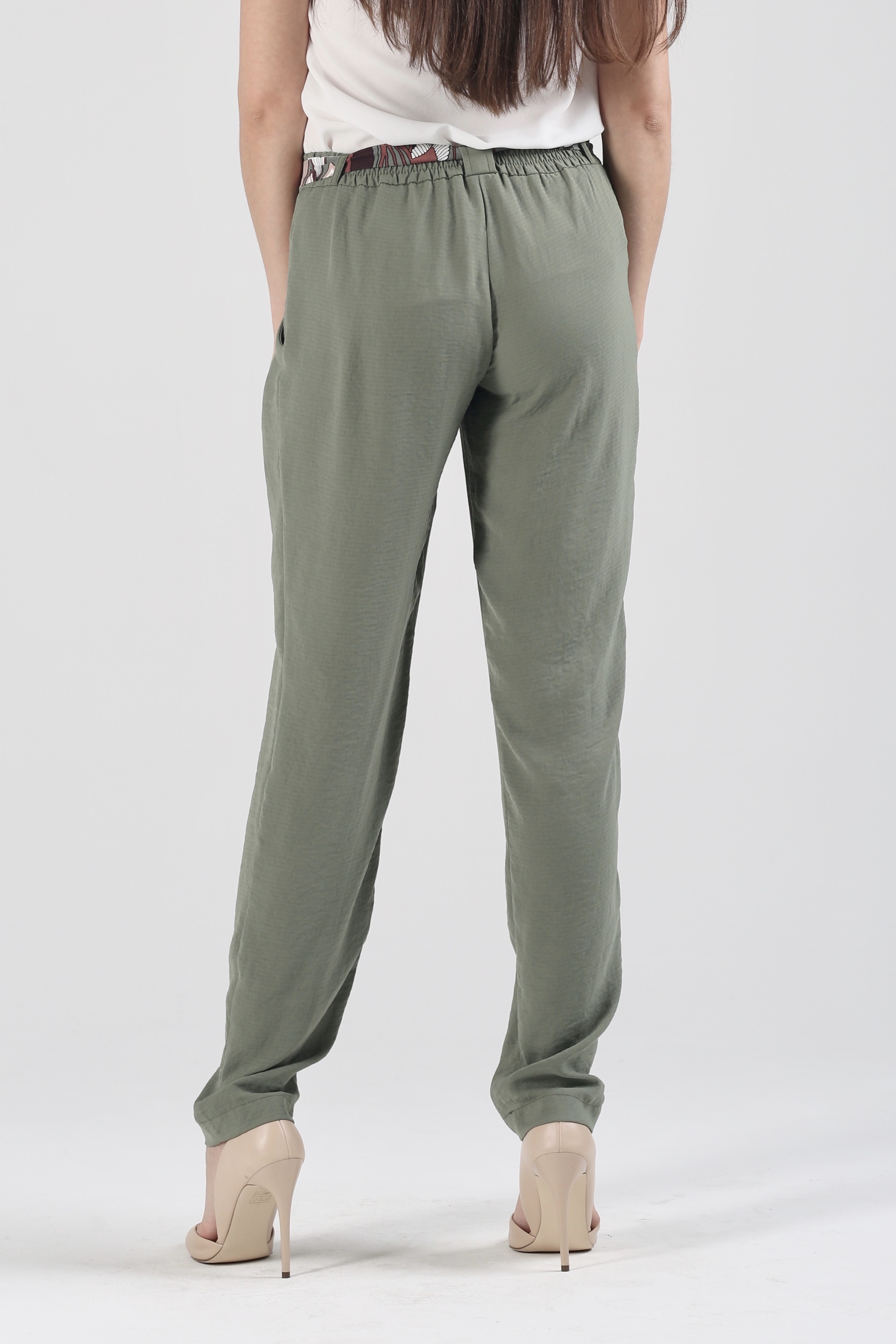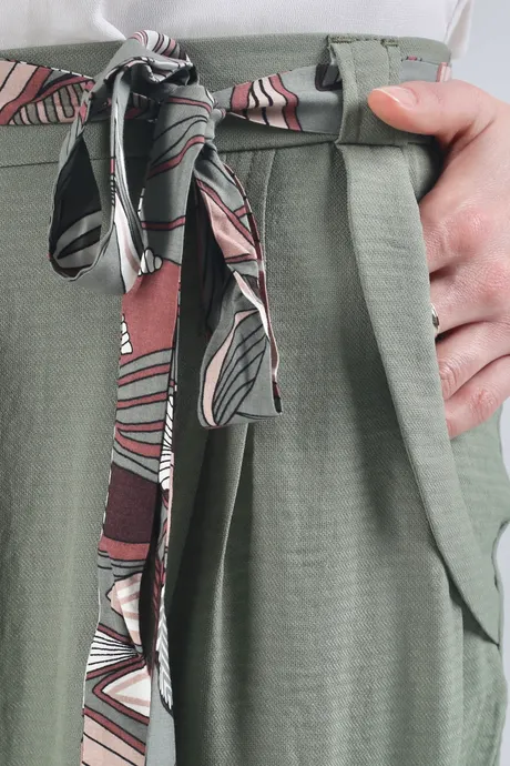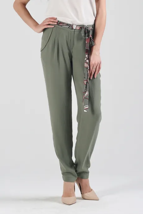 Свободные силуэты и воздушные ткани идут абсолютно всем девушкам. Именно поэтому брюки на средней посадке на резинке с цветным поясом «Шелк Комдар» травяного оттенка украсят как миниатюрных барышень плотного телосложения, так и высоких стройных женщин. Легкая, романтичная модель определенно понравится поклонницам женственных образов. Наслаждайтесь изяществом плавных линий, дополняя струящиеся брючки любимыми кружевными блузами, романтичными туниками и тонкими кофточками без рукавов.