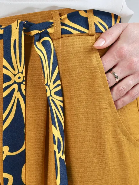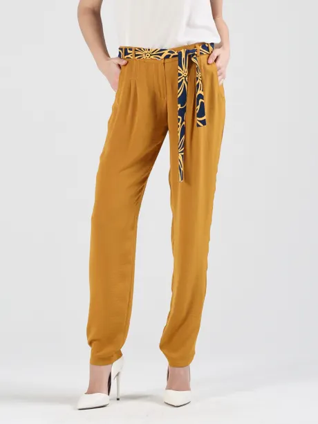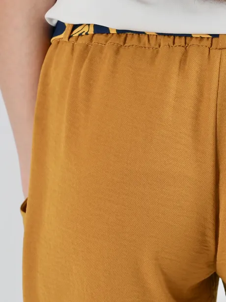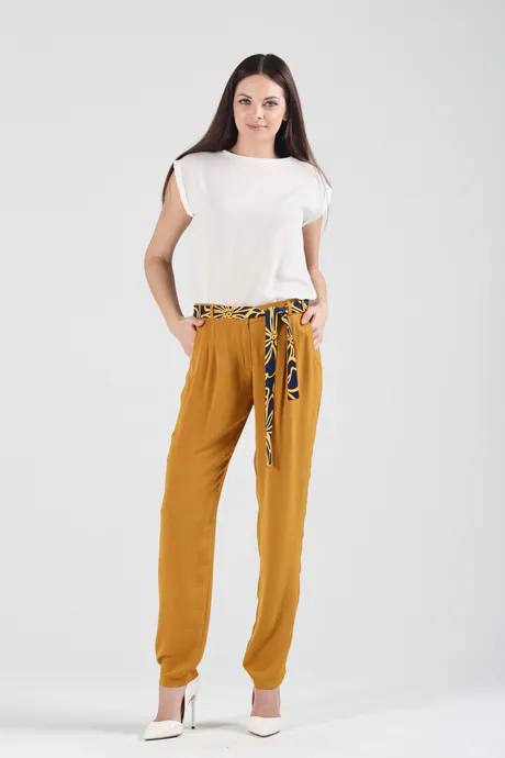 Любите воздушные ткани и теплые оттенки? Значит, горчичные брюки на высокой посадке на резинке с цветным поясом «Шелк Комдар» вам определенно придутся по вкусу. Легкая ткань на основе вискозы и шелка – оптимальный выбор для летне-весенних нарядов. В свободно струящейся одежде можно не опасаться перегрева и дискомфорта – вы будете ощущать свежесть, нежность и мягкость где бы ни находились.