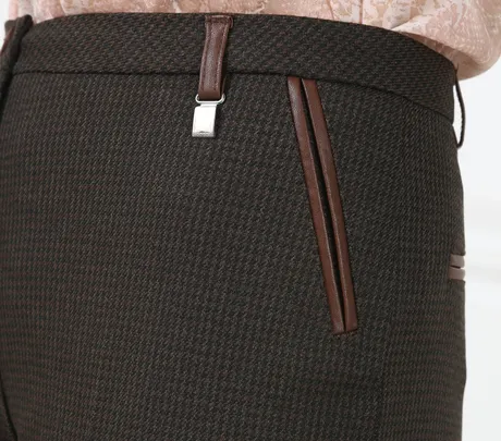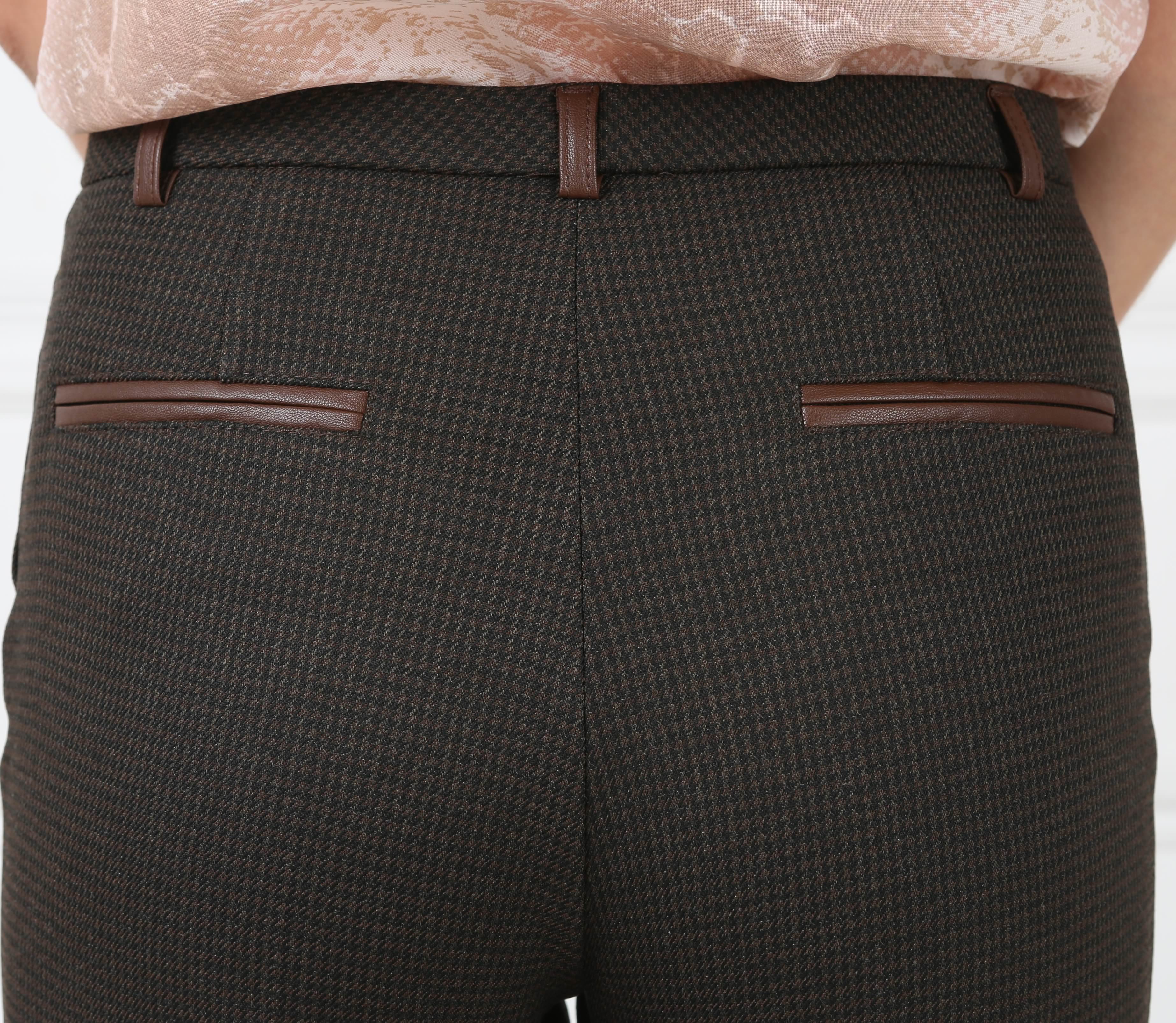 Брюки коричневые на средней посадке зауженные к низу с отделкой из кожи - «Виндзор»