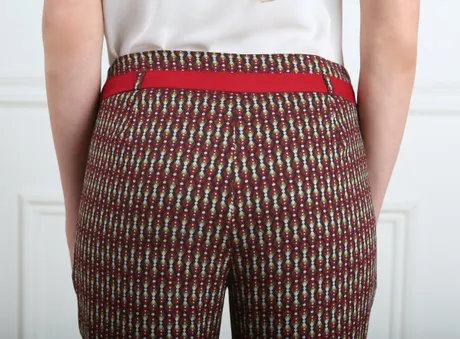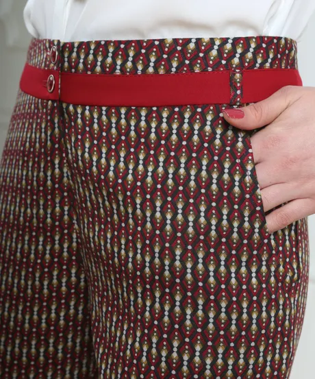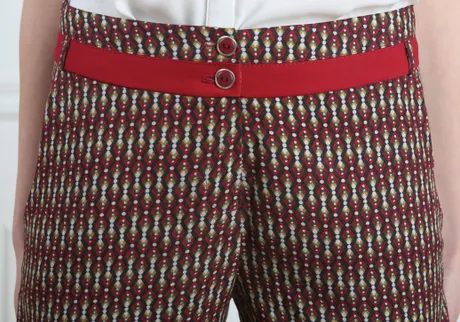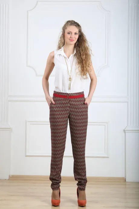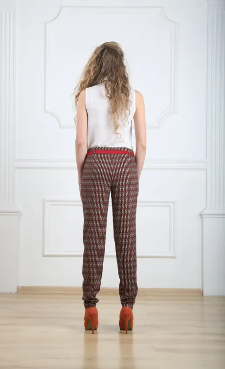 Брюки красно-желтые на средней посадке зауженные с карманами и отделкой - «Ромбики»