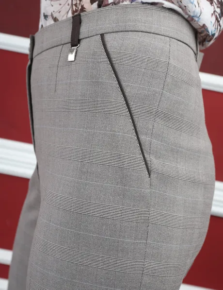 Брюки серые на высокой посадке зауженные к низу с карманами - «Клетка классическая»