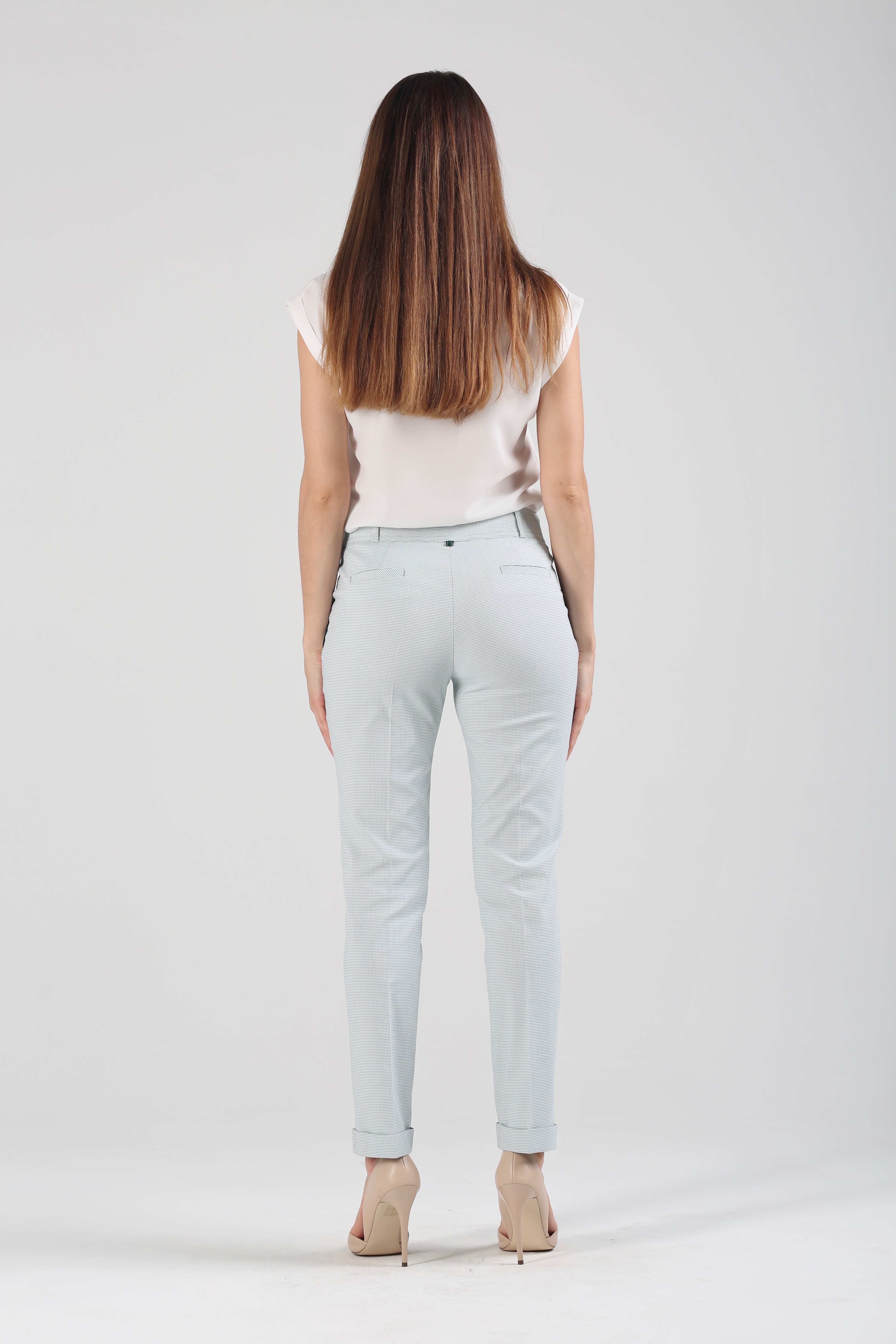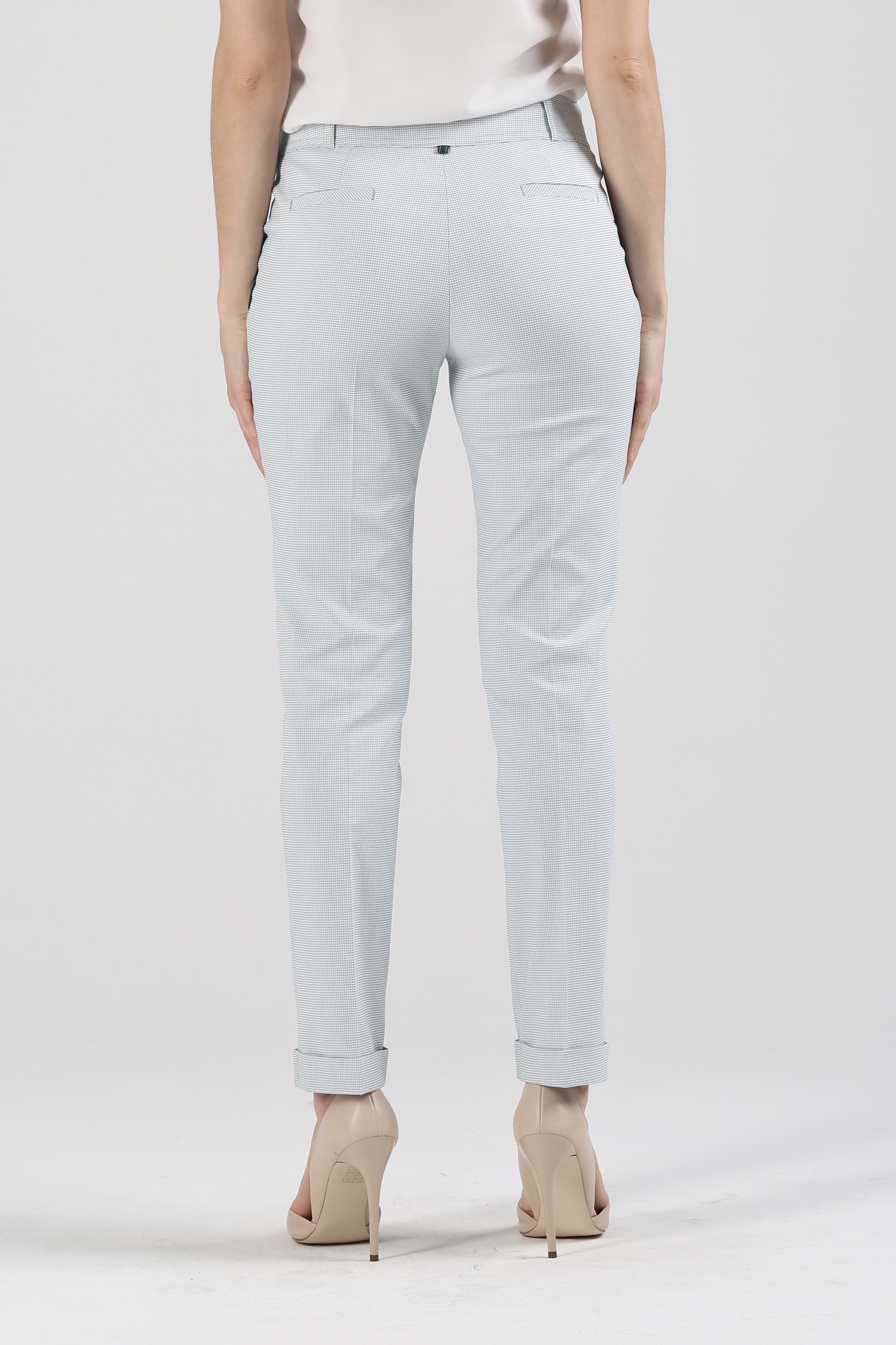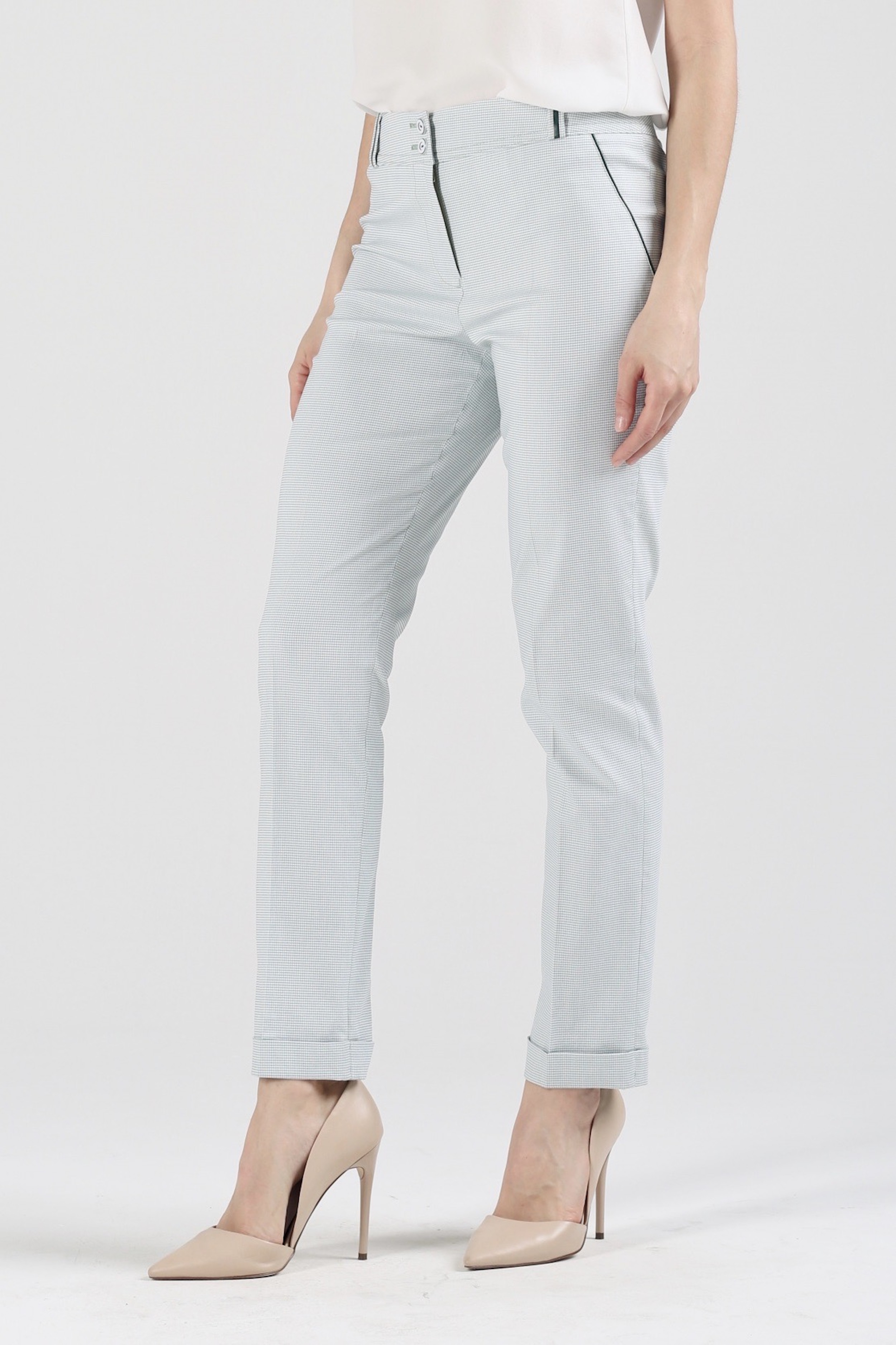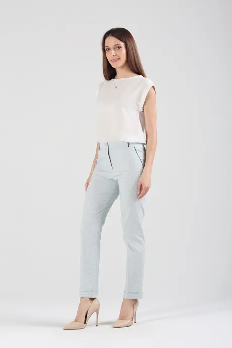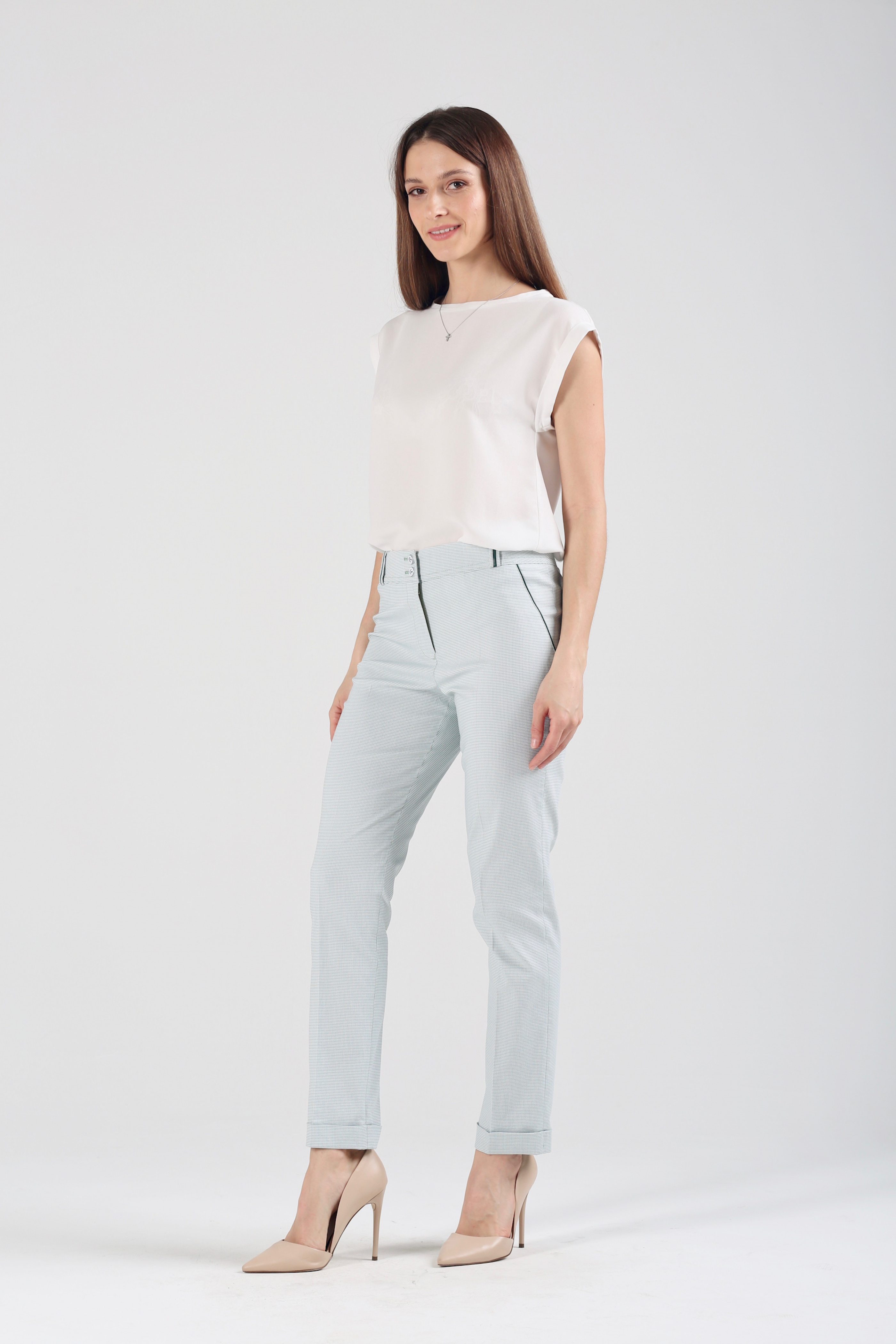 За основу при пошиве стильных зауженных к низу брюк взяты хлопок и вискоза – два практичных, уютных, прочных материала, превосходно держащих форму, обеспечивающих свободу движений. Ослепительный белый фон, украшенный изящной мелкой клеточкой зеленого цвета, облегчает образ, делает его более заметным, ярким, торжественным. Модель «Райбер» станет не только удачной основой для повседневной рабочей одежды, но подойдет и в качестве наряда для светских мероприятий, если дополнить ее подходящим верхом и обувью. Удобная средняя посадка прекрасно сочетается с заправленными в брюки классическими блузами, расклешенными воздушными туниками, короткими джемперами, трикотажными фуфайками с четвертным рукавом. Универсальная длина 7/8 не требовательна в плане выбора обуви. Дополняйте ее легкими сандалиями, мягкими эспадрильями, строгими туфлями и романтичными балетками.