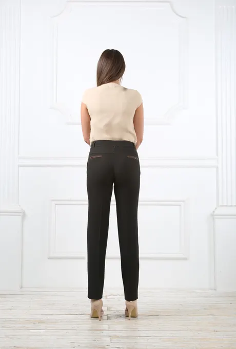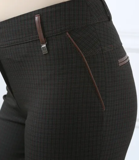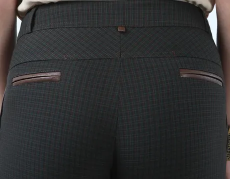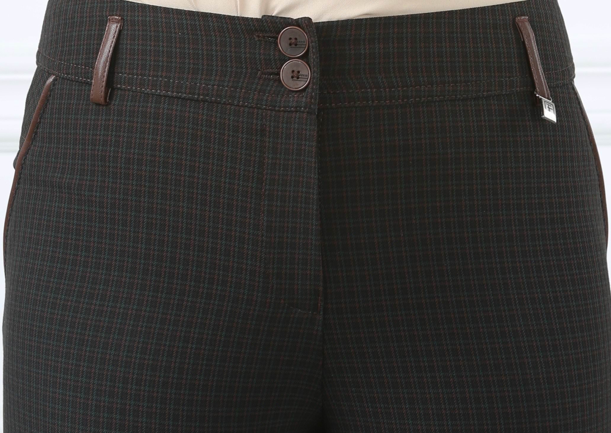 Брюки с узором «Клеточка пье-де-кок» и отделкой из рыжей кожи смотрятся очень стильно! Хорошая посадка и качество материала.