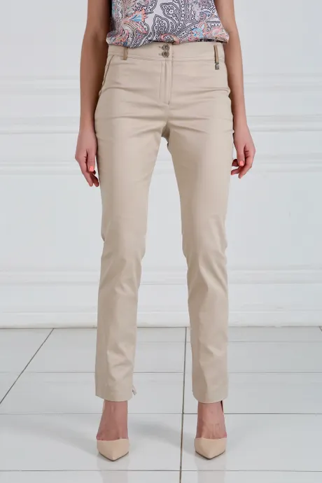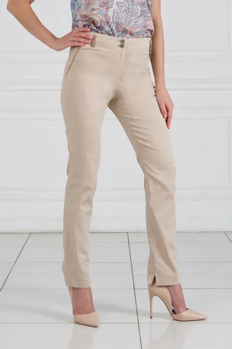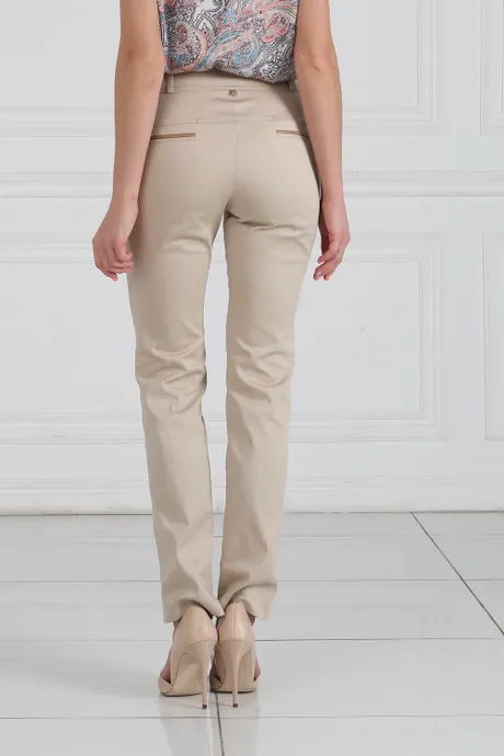 Летом элегантные хлопковые брюки длиной 7/8 можно носить с тонкими ажурными туниками и шелковыми рубашками без рукавов. Весной удачной парой к зауженной к низу модели на средней посадке станут классические заправленные под ремень блузы пастельных тонов, уютные худи, практичные водолазки и яркие джемпера. Мягкий бежевый оттенок сочетается абсолютно с любыми цветами: от безупречного белого до броского алого. Особую элегантность брючкам «Хлопок» дарит эффектная отделка из кожи, украшающая карманы и пояс.