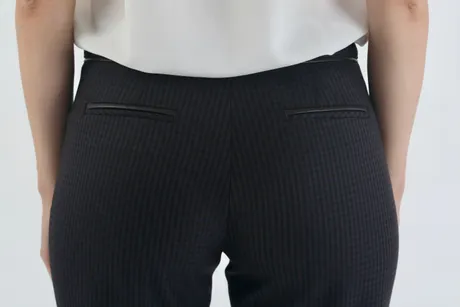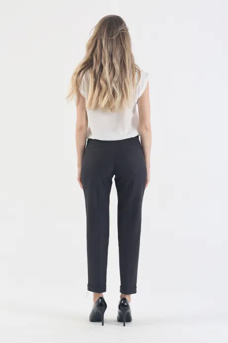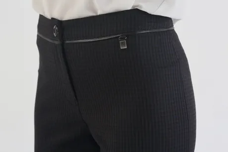 Элегантная мелкая клетка – удачная основа для нарядов в классическом стиле. Серо-синие зауженные к низу брюки 7/8 на средней посадке «Стюарт» с изящным геометрическим узором идеально подходят в качестве повседневной одежды для деловых леди и офисных сотрудниц. В дизайнерской модели гармонично сочетаются нежность, строгость и женственность. Она прекрасно вписывается в дресс-код, не притязательна в плане цветовых и стилевых сочетаний, что дает простор для экспериментов и оригинальных комбинаций.
