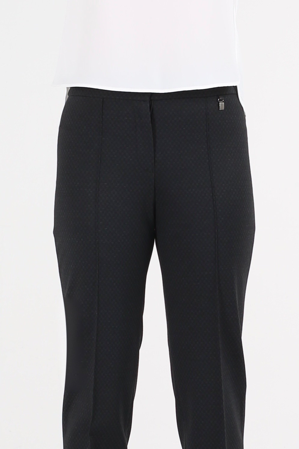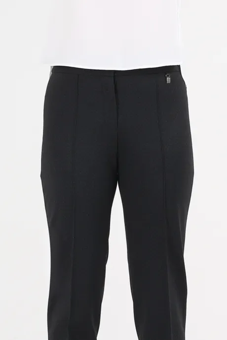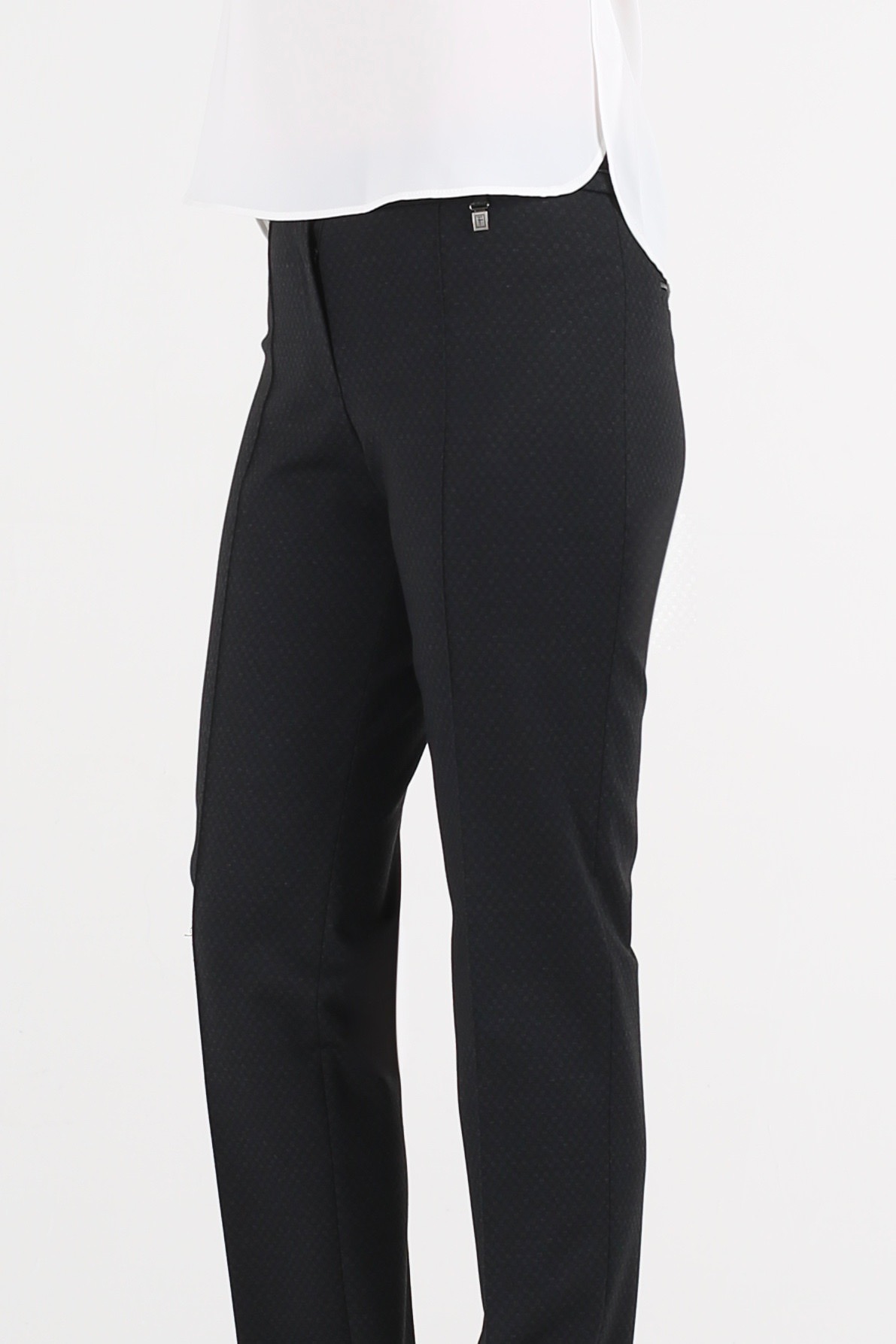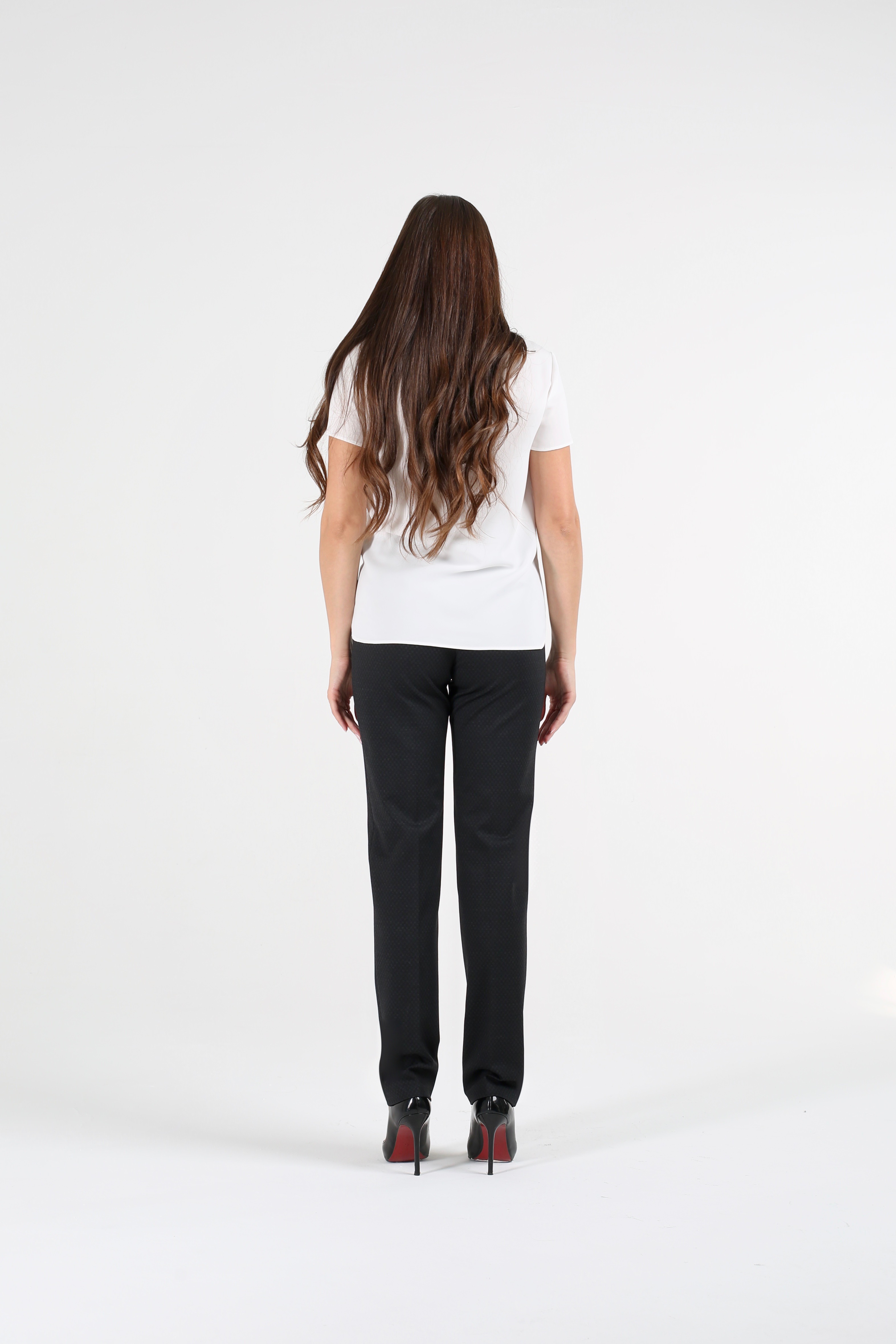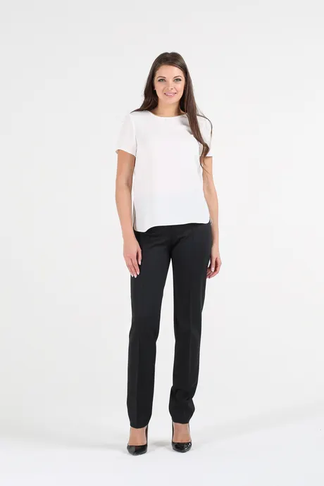 Главная особенность модели «Трикотаж. Крупные соты» – особая фактура ткани. Легкий принт в виде мелких геометрических узоров, дополненный оригинальными вшитыми стрелками, придает традиционному наряду утонченность и женственность. Даже, сочетая зауженную к низу брюки на средней посадке со строгими хлопковыми рубашками, вы будете выглядеть обаятельно. А если по душе яркие молодежные образы, украсьте серо-черную модель роскошными блузами сочных цветов, не забывая заправлять их. Так вы всегда будете выглядеть модно. Остается только выбрать стильную обувь, освоить королевскую осанку – и можно отправляться на покорение любых высот.