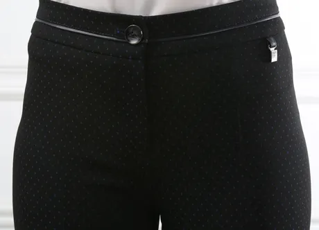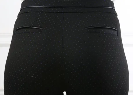 Очень красивые брюки! Синие точки на черном фоне выглядят оригинально, а зауженные штанины и кожаная отделка добавляют им стиля. Сидят прекрасно!