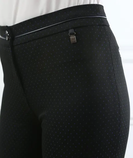 Брюки черные с синими точками на средней посадке зауженные к низу с отделкой из кожи - «Хевис»