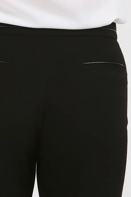 Черный цвет универсален в выборе сочетаний, поэтому брючки «Астория» можно комбинировать с верхом абсолютно любых цветов. Наденьте со стильной зауженной к низу моделью нежную тунику лавандового или мятного оттенка, чтобы получить легкий, свежий образ. Включите в офисный ансамбль блузы кремовых, бежевых, коралловых или персиковых тонов, чтобы выглядеть утонченнее. Хорошей парой к строгому темному цвету станет благородный винный, насыщенный изумрудный или теплый оранжевый. Удобная средняя посадка позволяет носить рубашки навыпуск или заправлять в брюки. Воспользуйтесь такой возможностью, чтобы подчеркнуть красоту кожаной отделки пояса.