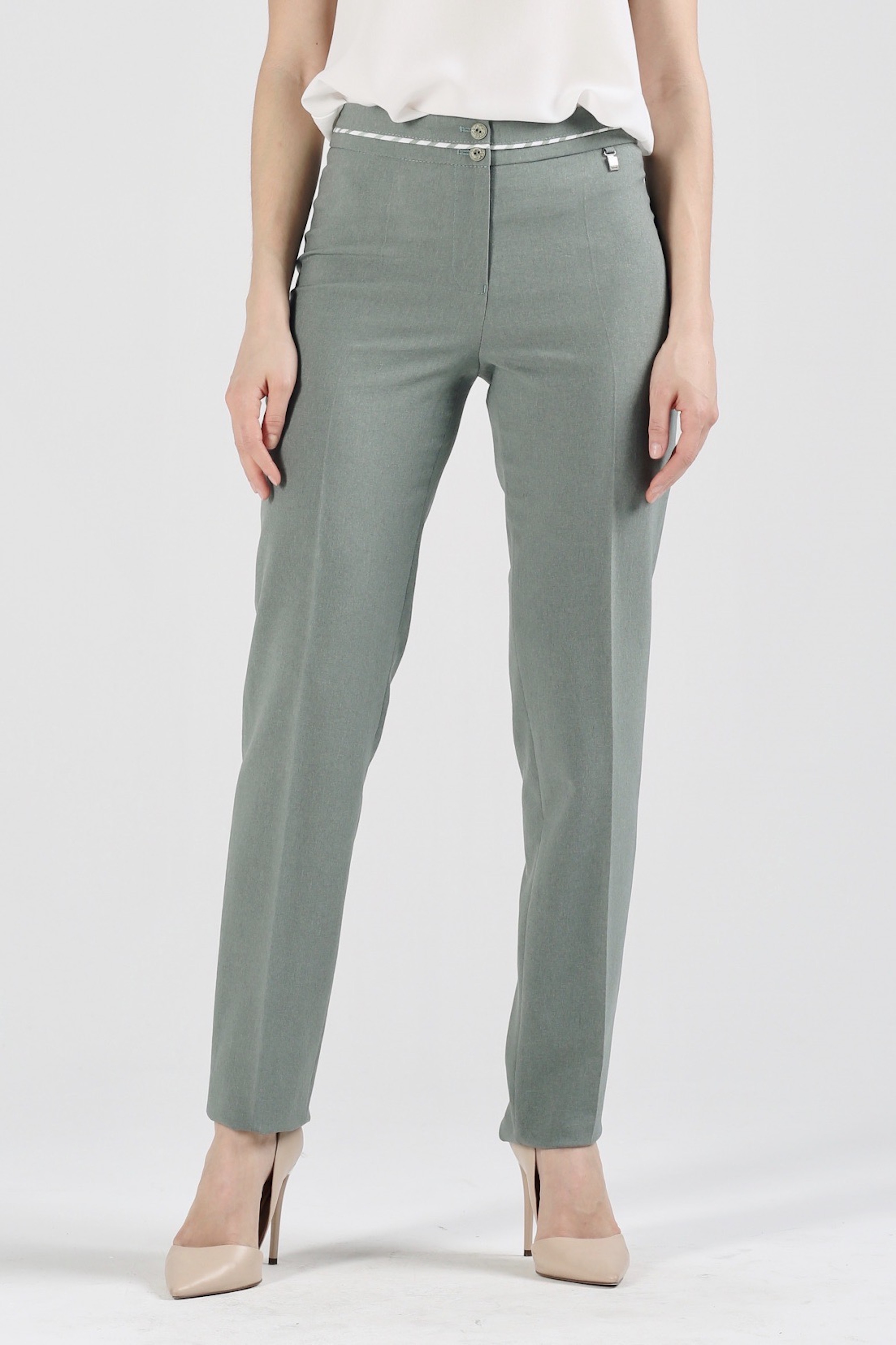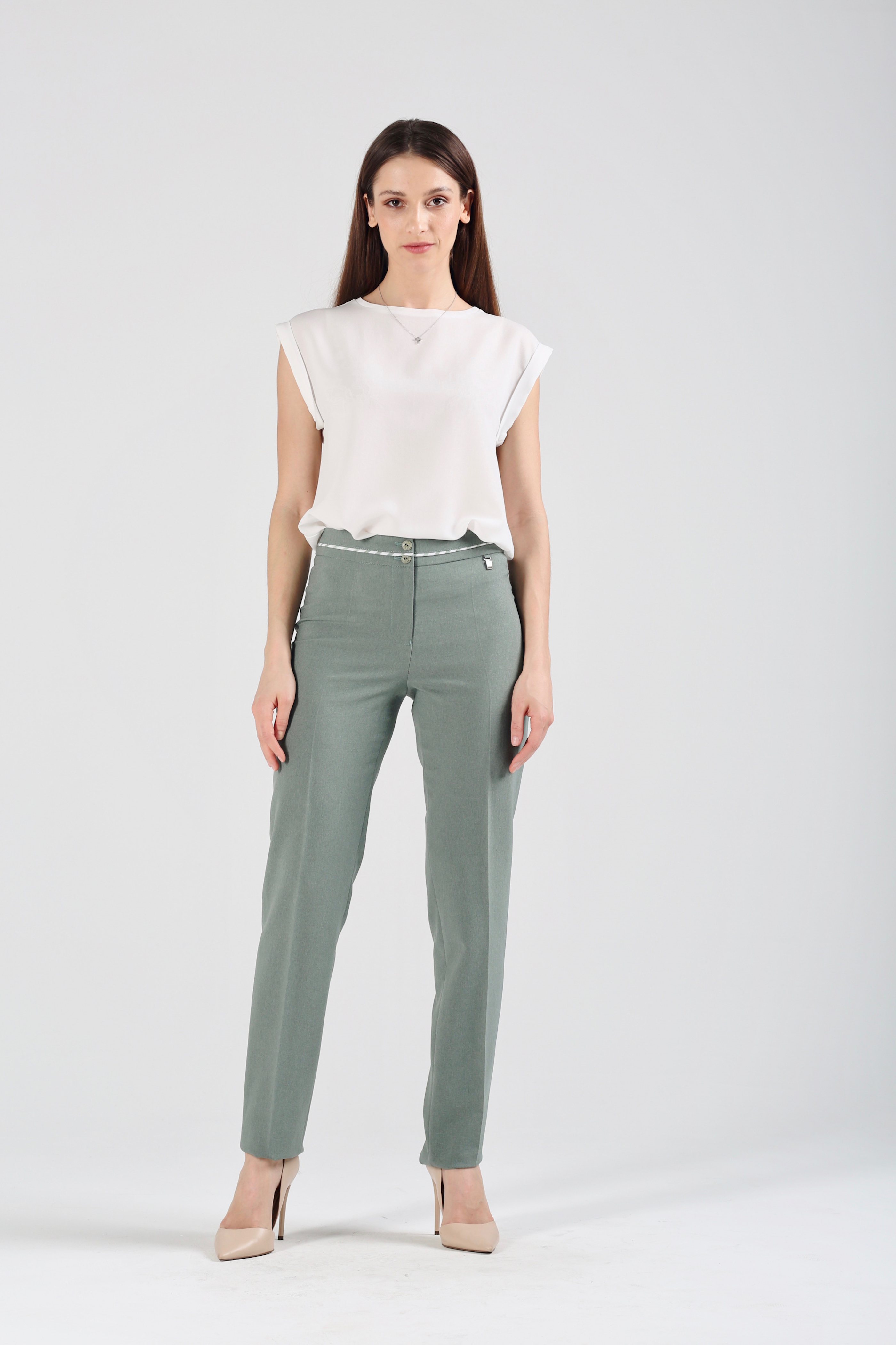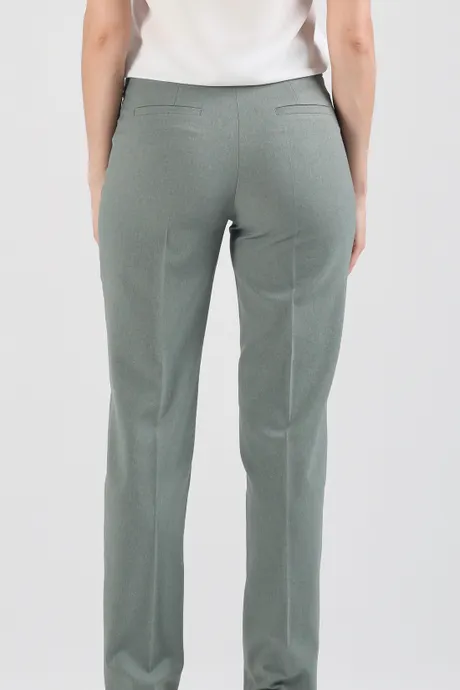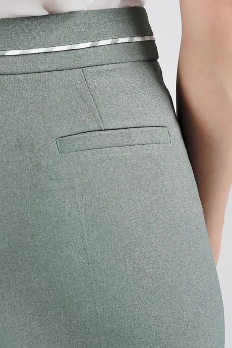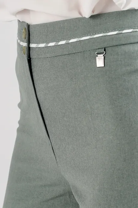 Брюки смотрятся на редкость элегантно – прежде всего, за счет классического покроя, а также благодаря уникальному цвету. Небольшая зауженность не бросается в глаза, поэтому создается ощущение, что это прямой фасон. По линии поясной планки оливково-зеленых брюк на средней посадке зауженных к низу «Доминикана» проходит светлый кант, что придает модели особенную нарядность. Изделие хорошо поддается работе с утюгом, поэтому вы вполне можете навести стрелки. К таким брючкам можно подобрать однотонный жакет, а также светлую или контрастную блузку или тунику. В качестве обуви отдайте предпочтение открытым туфлям или высоким узким ботинкам на удобном каблуке.